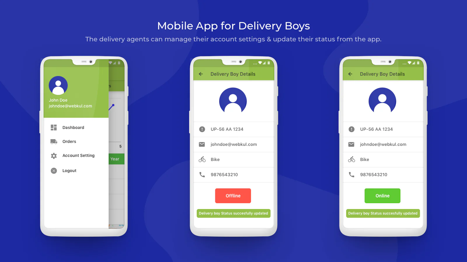 Mobile App for the delivery agents: Agents can install the “Delivery Boy” mobile app to their android or iOS phones to update the order status & manage deliveries.