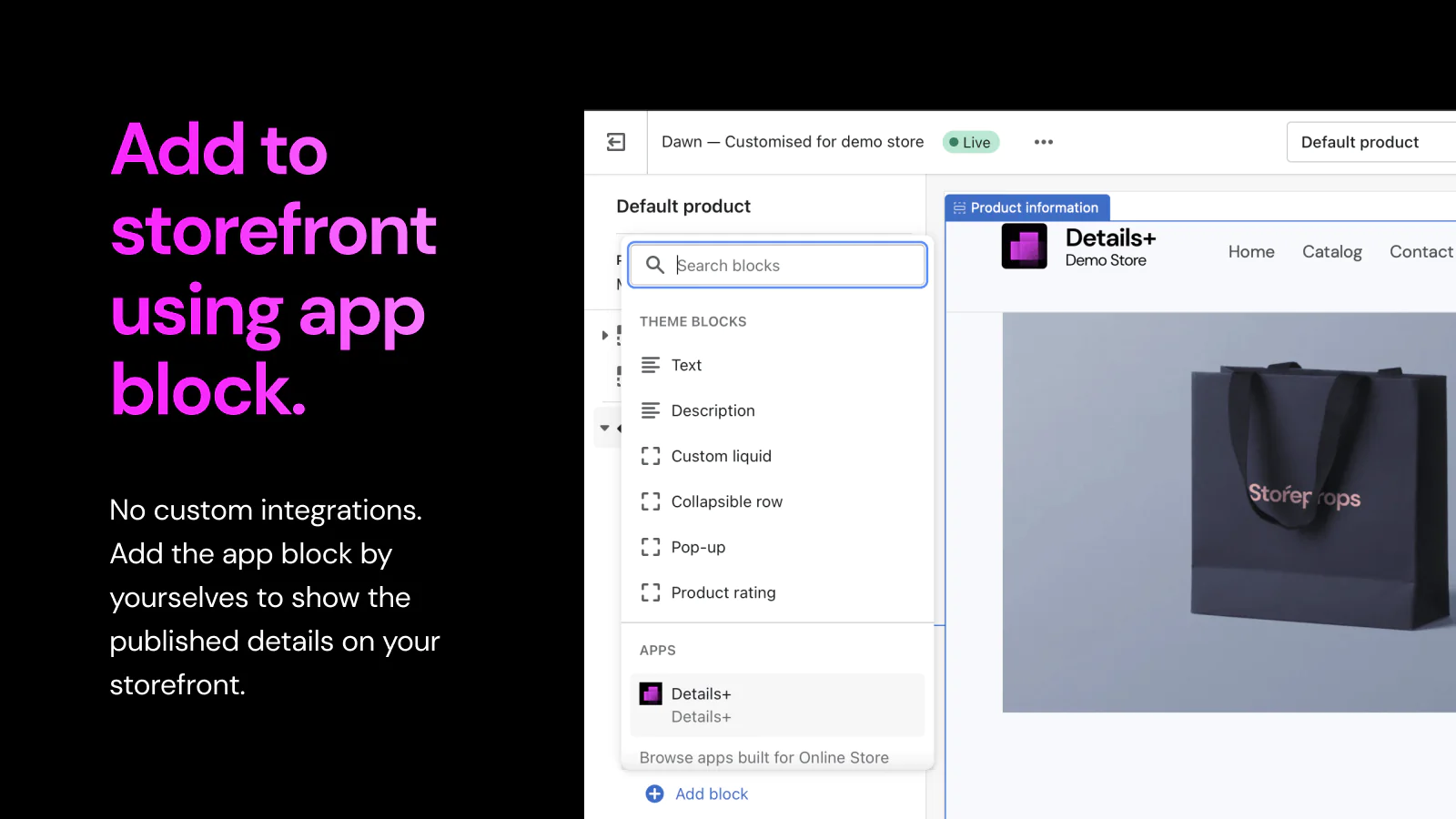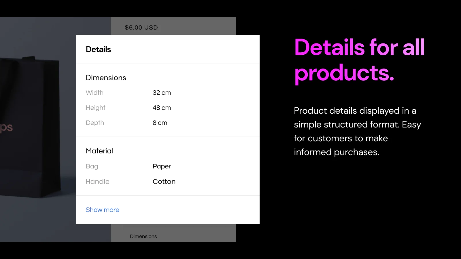 A store that is informational. A store where it is easy to make the right buy. A store with fewer returns. Nobody wants to read through long product descriptions to buy a product. Details+ makes it easy for customers to get product information. Any information that makes it easy for them to buy right and buy more.