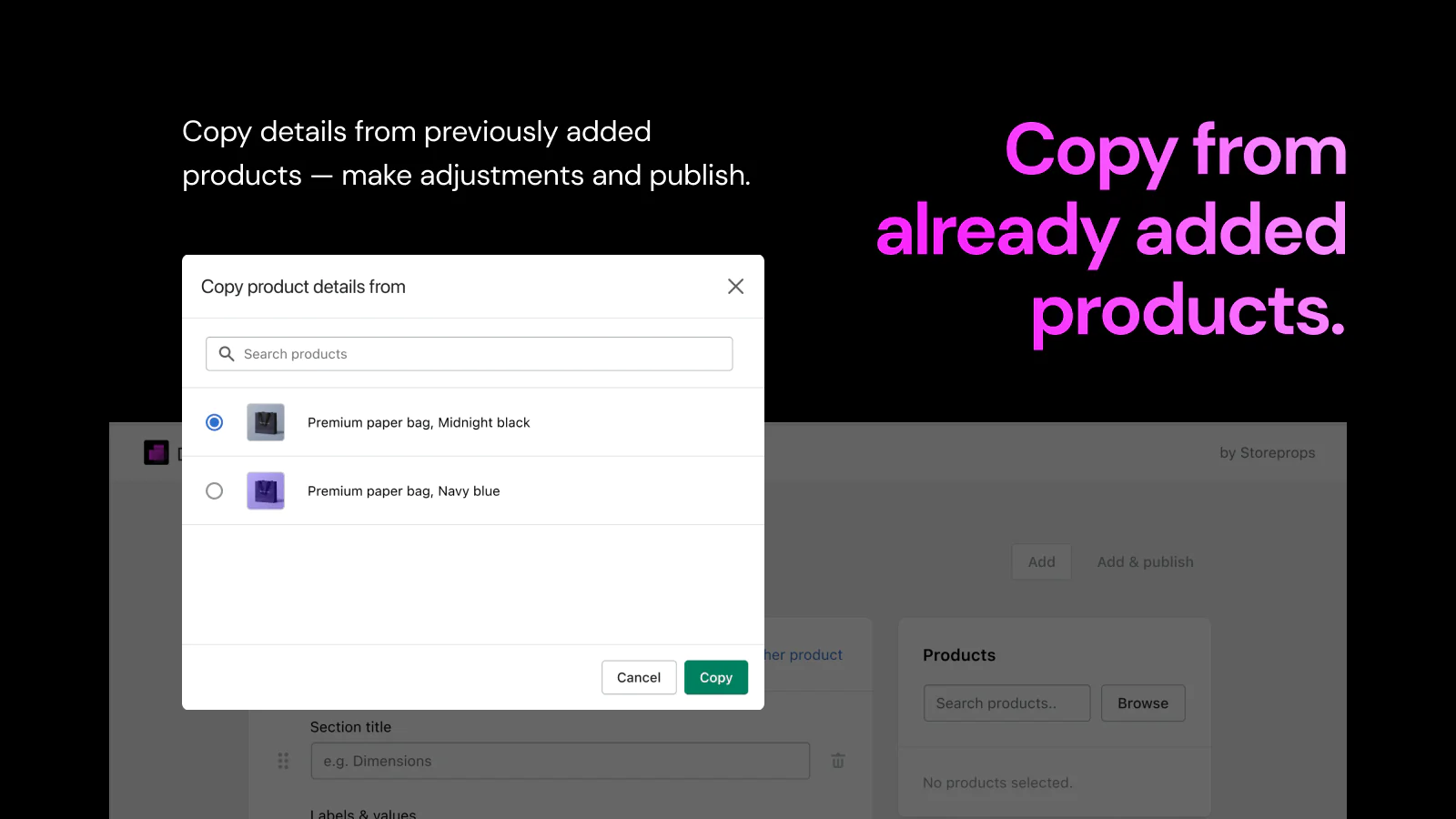 Copy, edit & publish : Copy from an already added product to another 100s or 1000s of SKUs in your store. Make necessary edits. Publish.