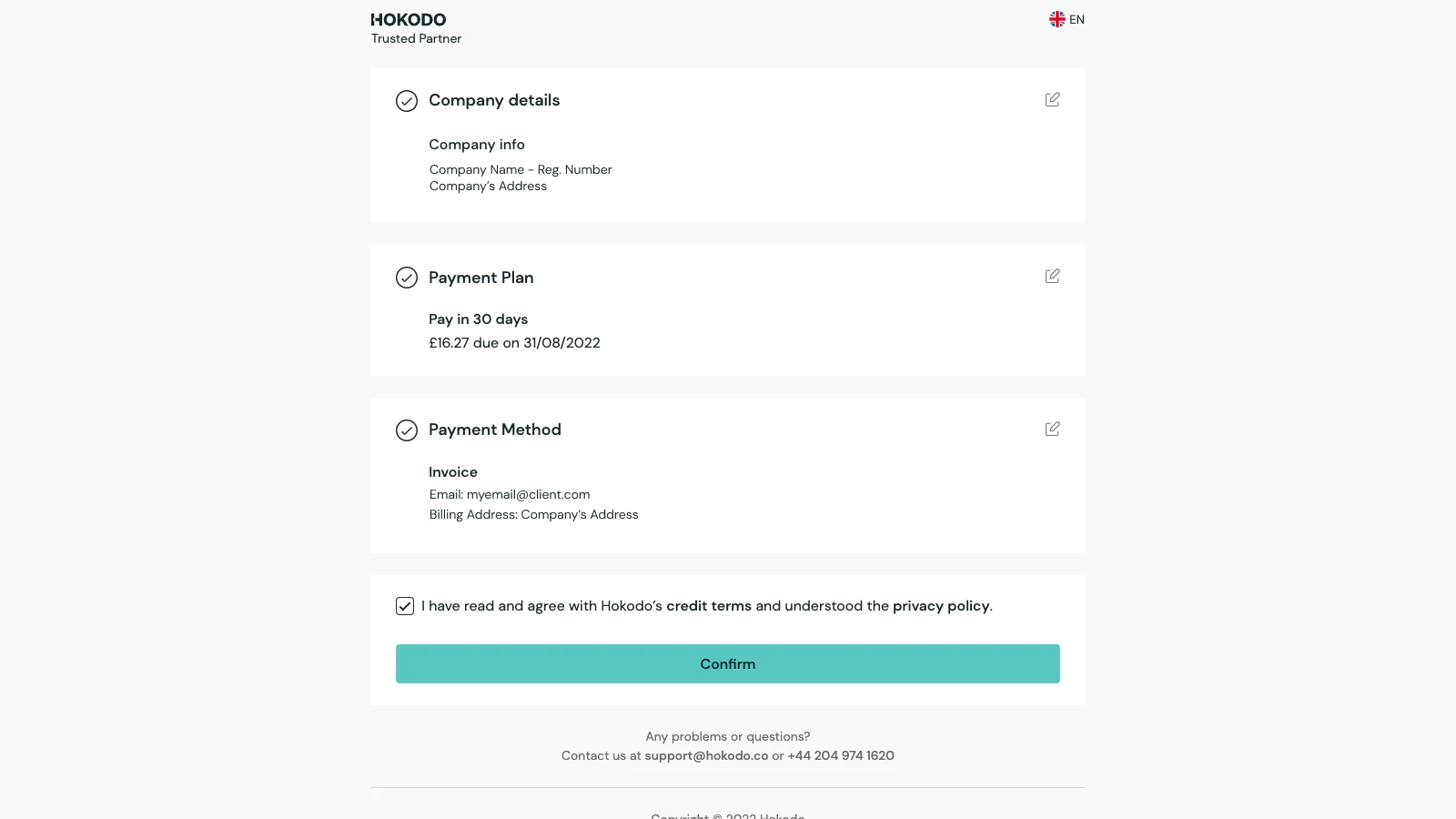 Reach your customers globally: Hokodo is the only B2B BNPL provider with a truly international footprint. Our solution is currently available in the UK, France, Spain, Germany, Belgium and the Netherlands.