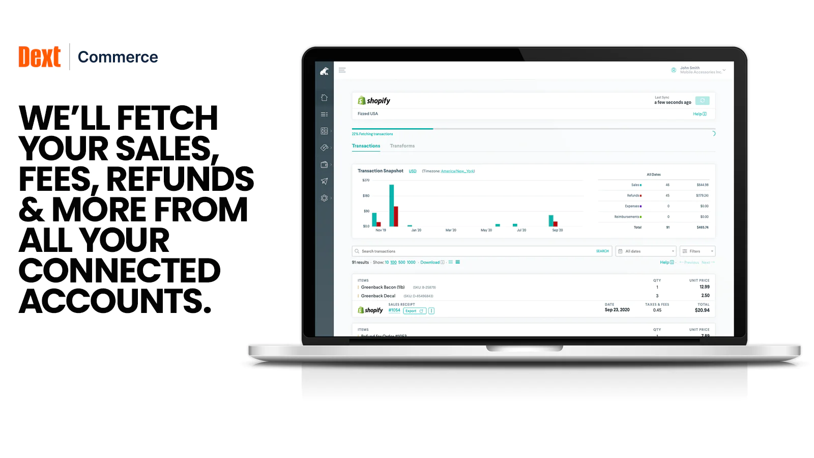 Fetch & Convert : Dext Commerce fetches and converts your sales, selling related expenses, refunds and reimbursements to GAAP compliant accounting data.