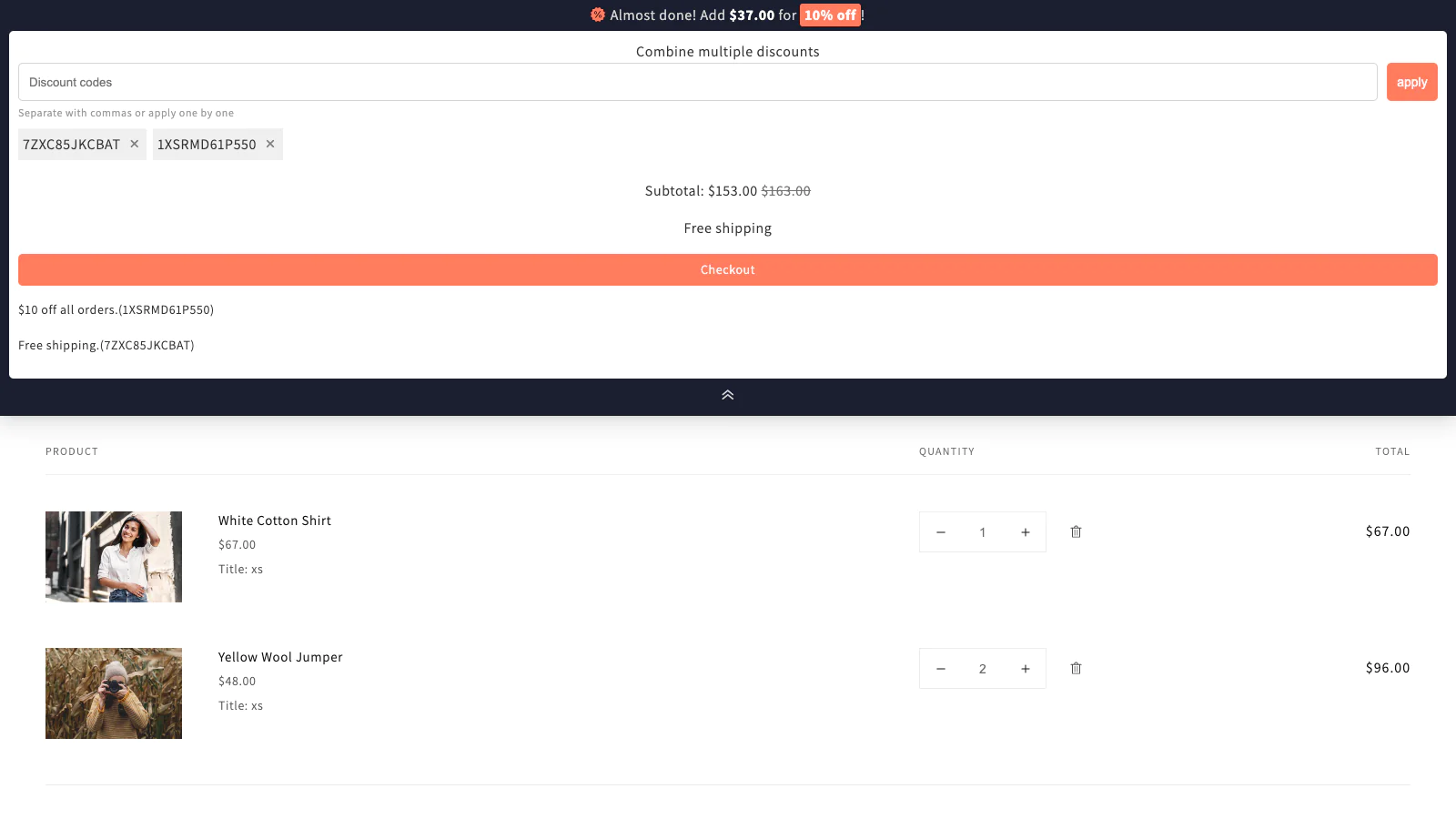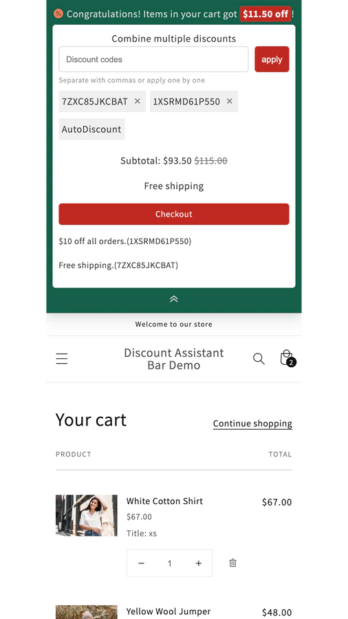 Combine multiple discounts : Customers can combine multiple discount codes and automatic discounts through an input box on the shopping cart page.