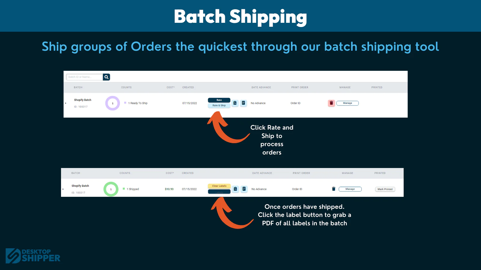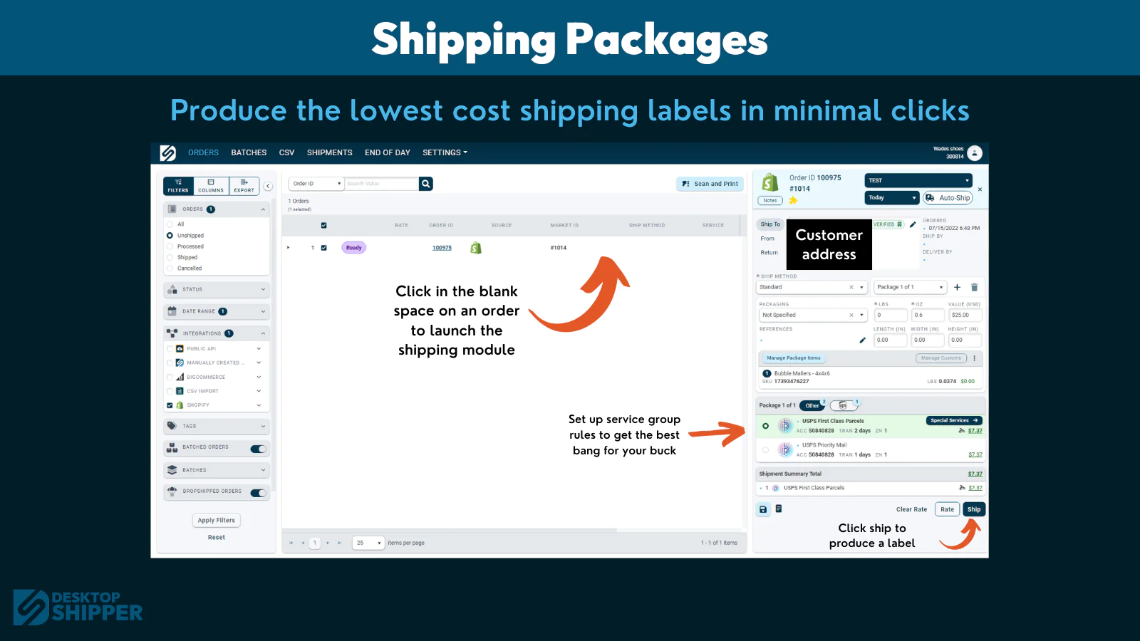 DesktopShipper is a web-based order management and shipping solution that syncs orders from all your marketplaces into one centralized view. Our innovative and easy-to-use system provides you with the tools to search and filter orders, create batches, and print labels. With all the automated features we have to offer, learn more about how we can help you start shipping faster for less by signing up for a free consultation!