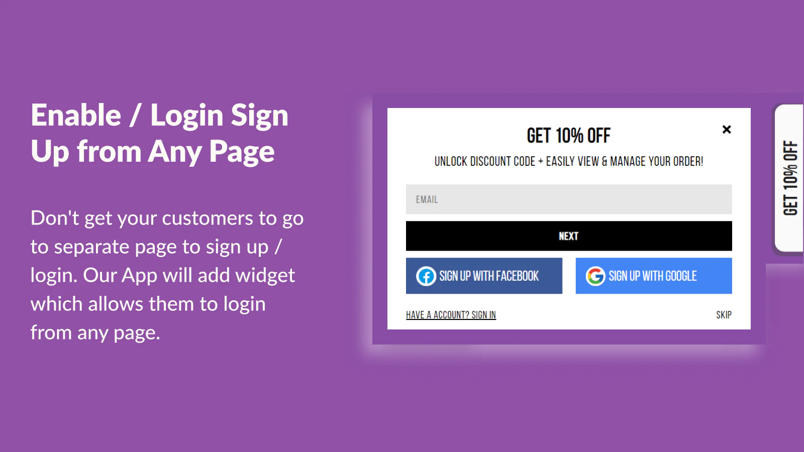 Our widget will allow store visitors to Sign Up / Login on to your store from any page without going to a separate login page.