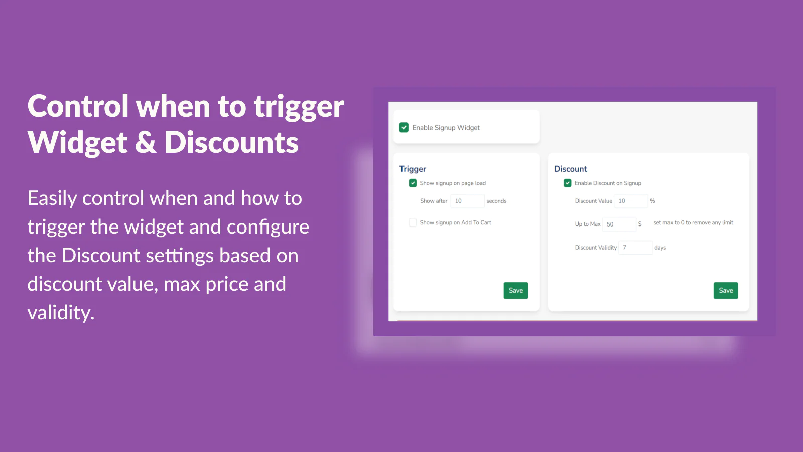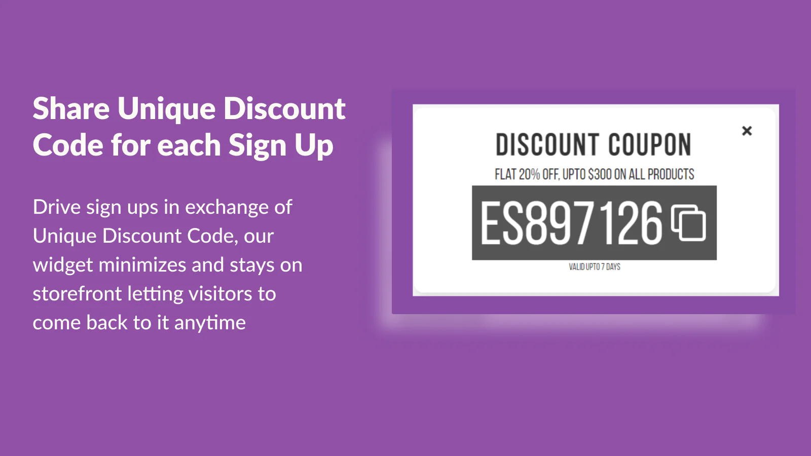 Discount for Sign Up : Drive sign ups in exchange of Unique Discount Code, our widget minimizes and stays on storefront letting visitors to come back to it anytime