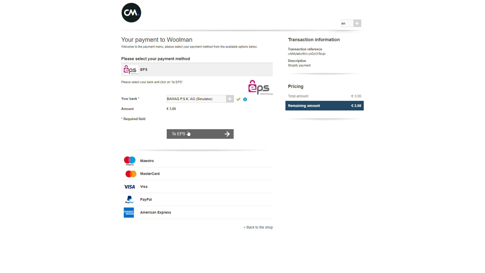 EPS by CM payments is a Shopify payment app that allows you accepting payments with EPS payment method.