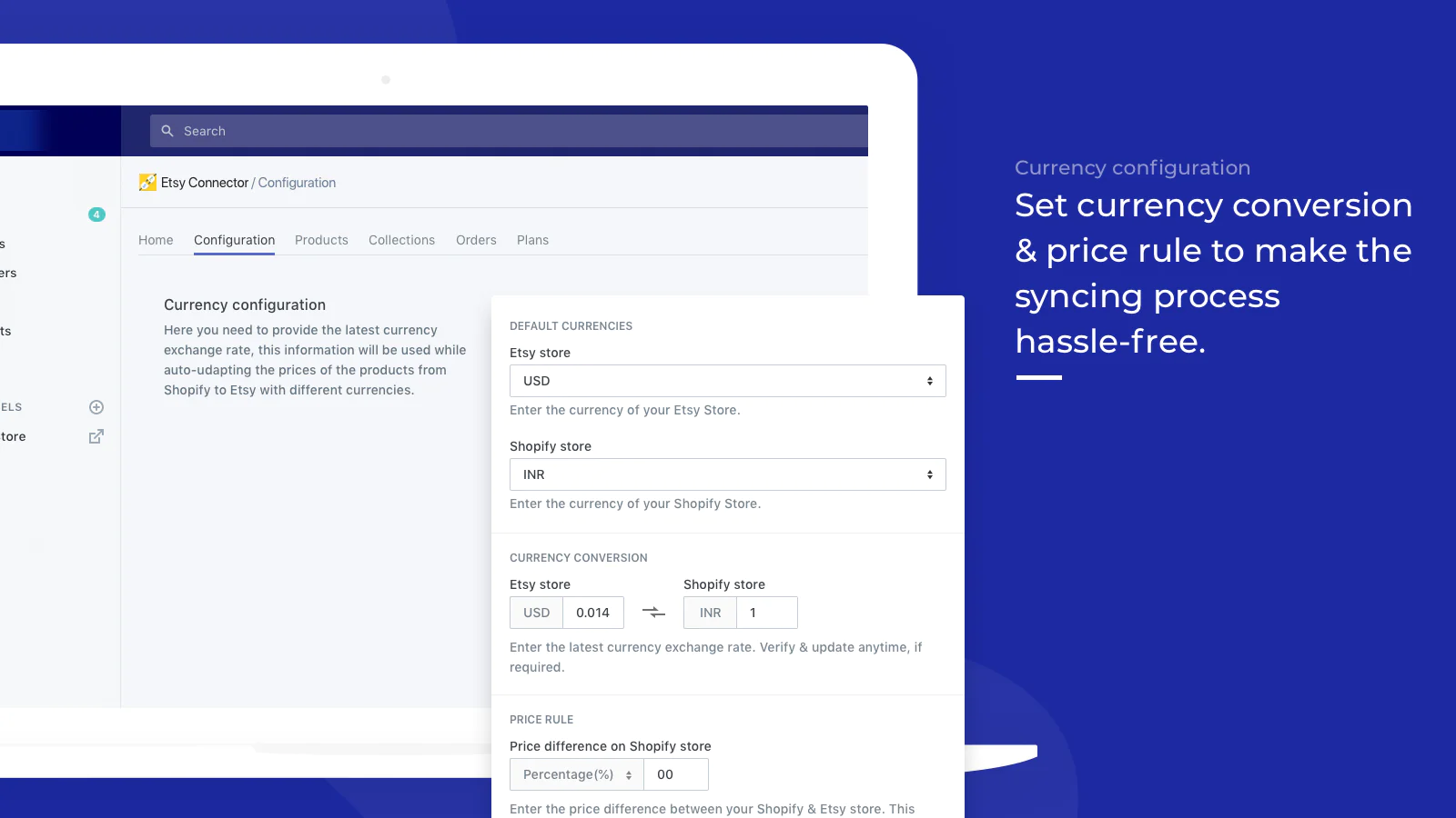 Currency Conversion Rates: The app lets you add Currency Conversion Rates. You need to provide the latest currency exchange rates. This information will be used while auto-updating the prices of the products from Shopify to Etsy with different currencies.