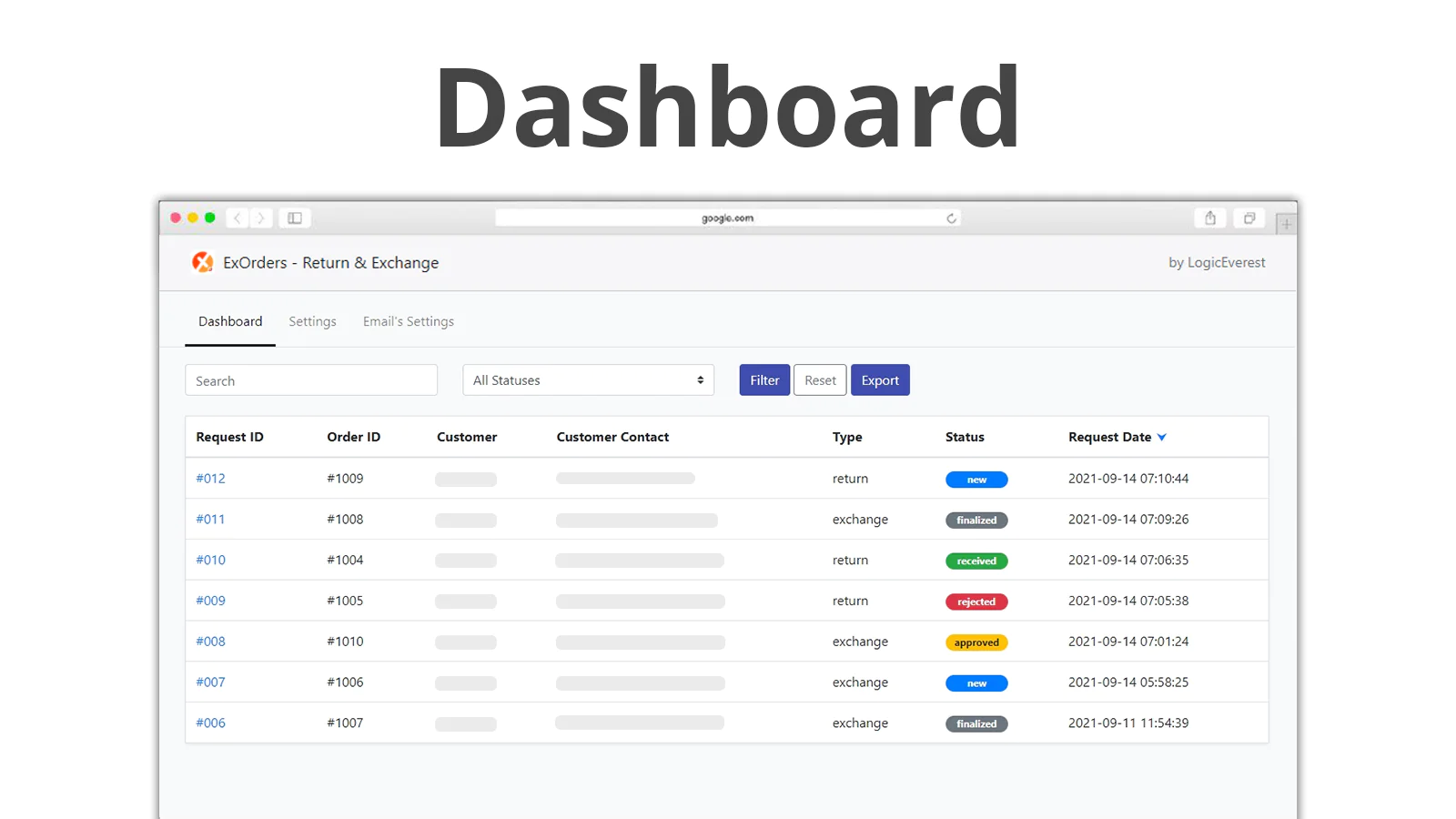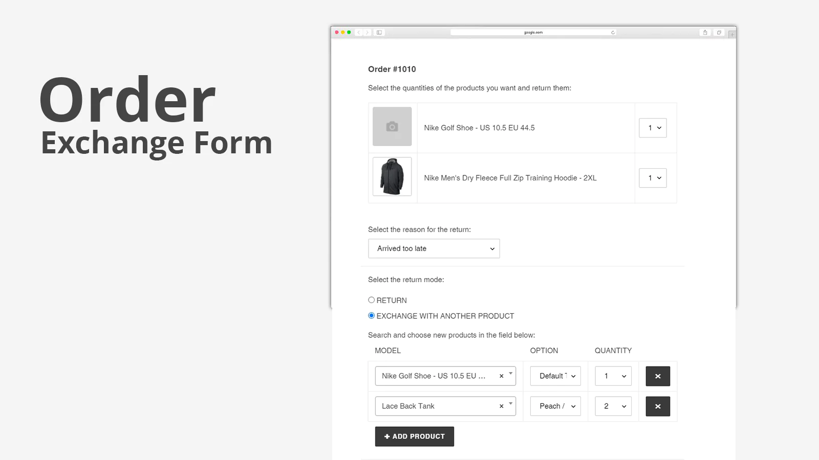Exorders return and exchange management portal for customers and merchants. Customers can apply for return order items as well as can replace them with other store items. Merchants have the option to approve or reject a return or exchange request.