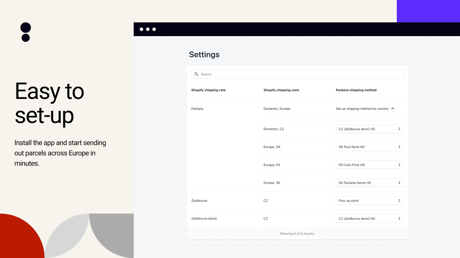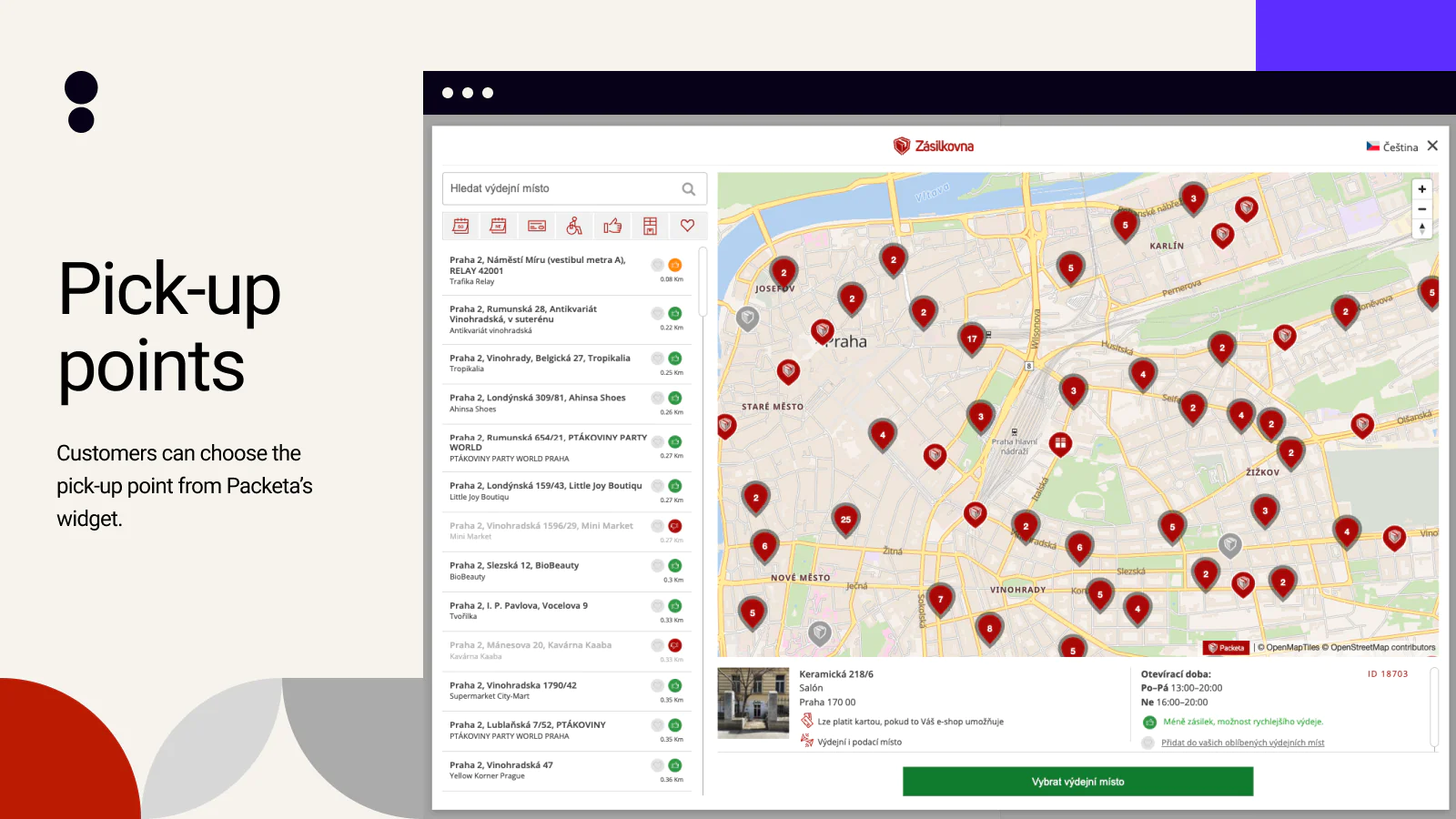 The Pakilkovna (Packeta) app allows your customers to choose from more than 6,300 pick-up points across the European Union. CSV exports and API integration will make syncing orders and creating packages very easy.