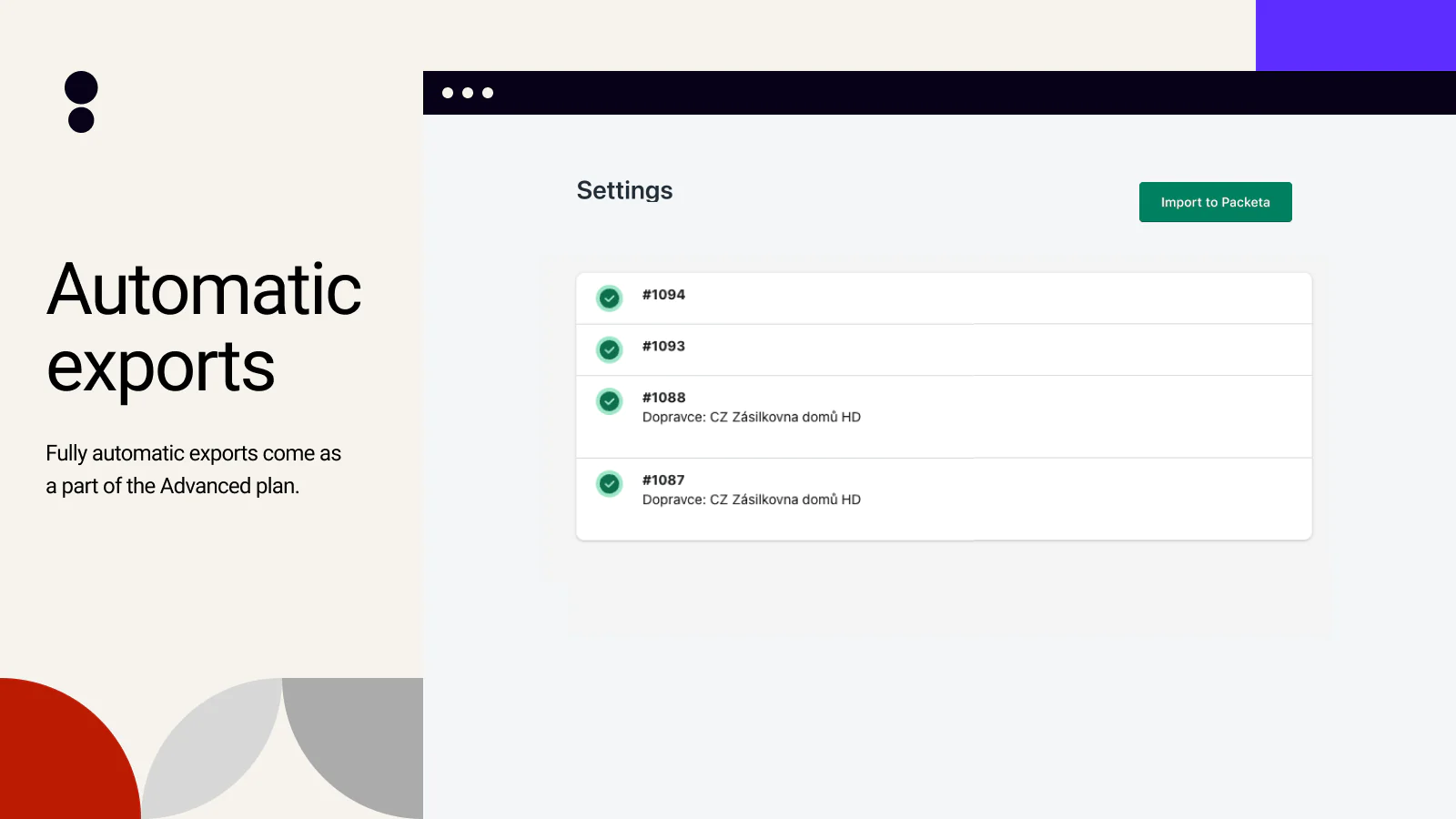 Order export via via API/CSV : Order export on one click via API or manual export via CSV, which you can add manually to the Packeta administration.