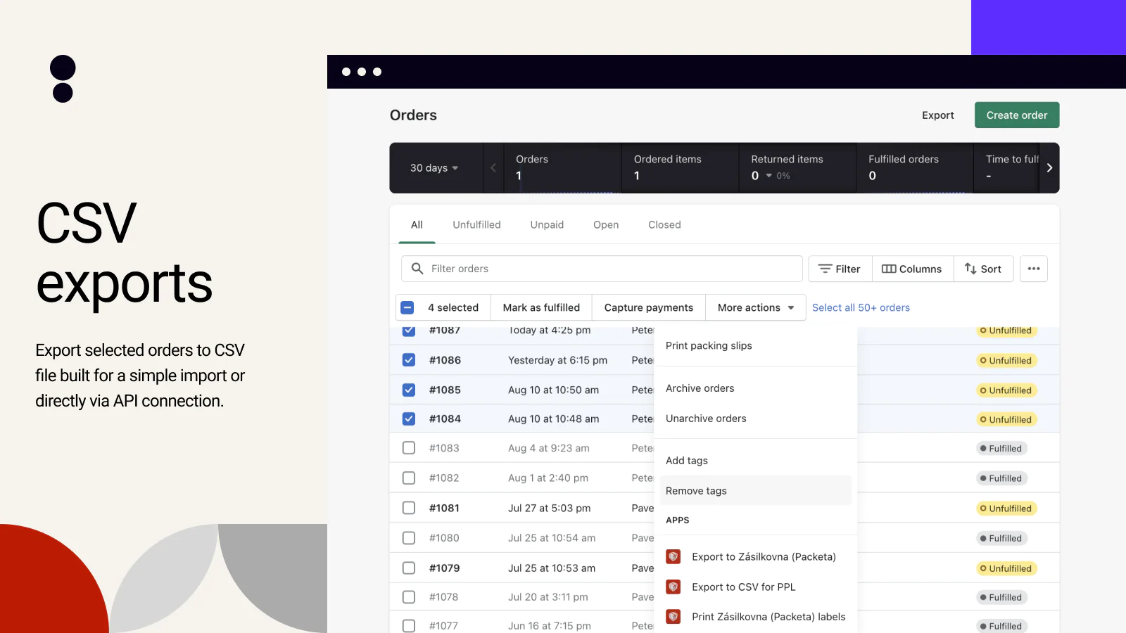 In both tariffs, you can also download orders from Shopify as a CSV file, which you can then paste into the Zasilkovna admin at once.