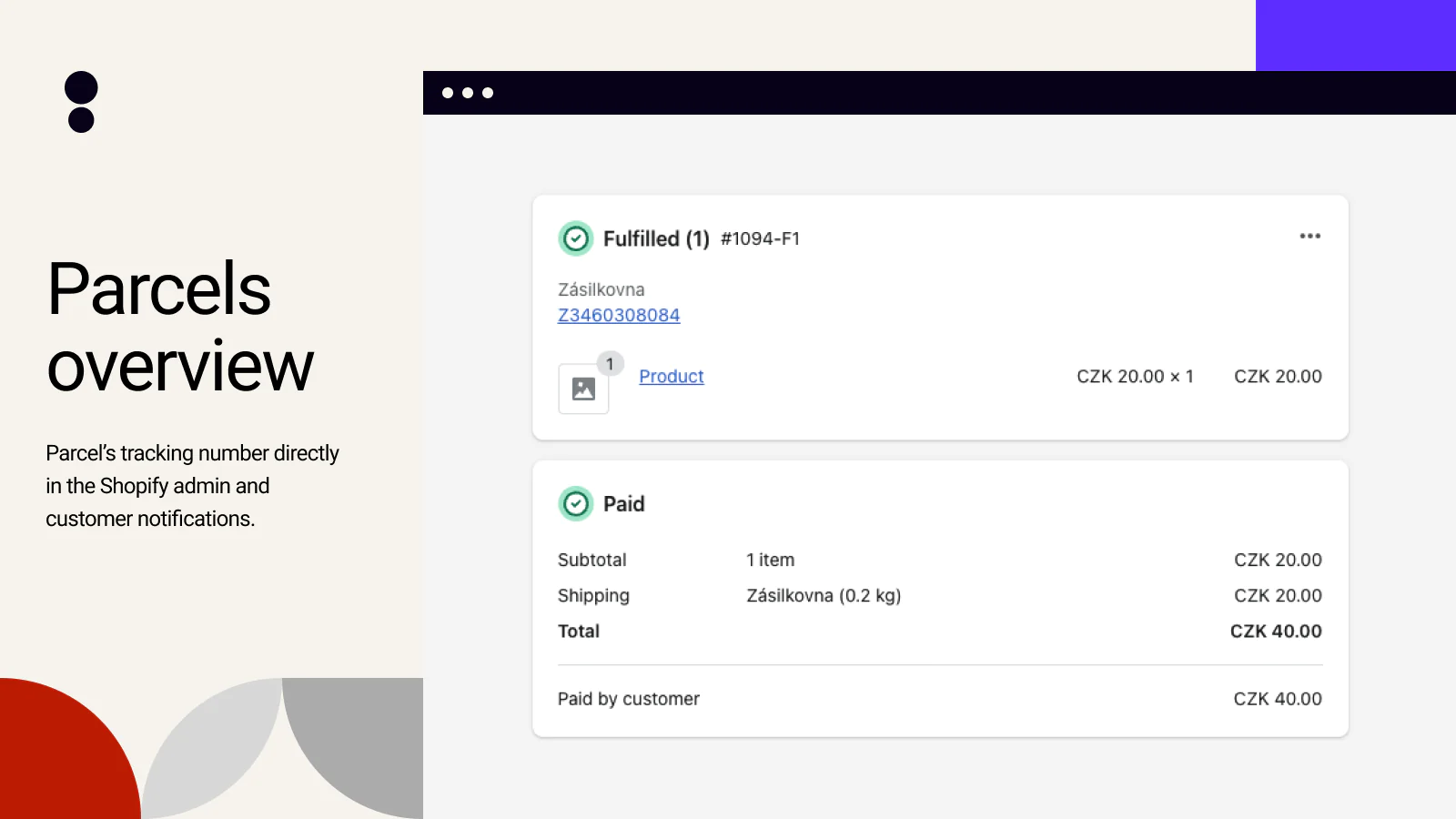 You can export orders from Shopify directly to Zasilkovna with one click. Our app then links the order's tracking number to Shopify and monitors its status directly in your admin. The data from Zasilkovna is automatically written to Shopify.