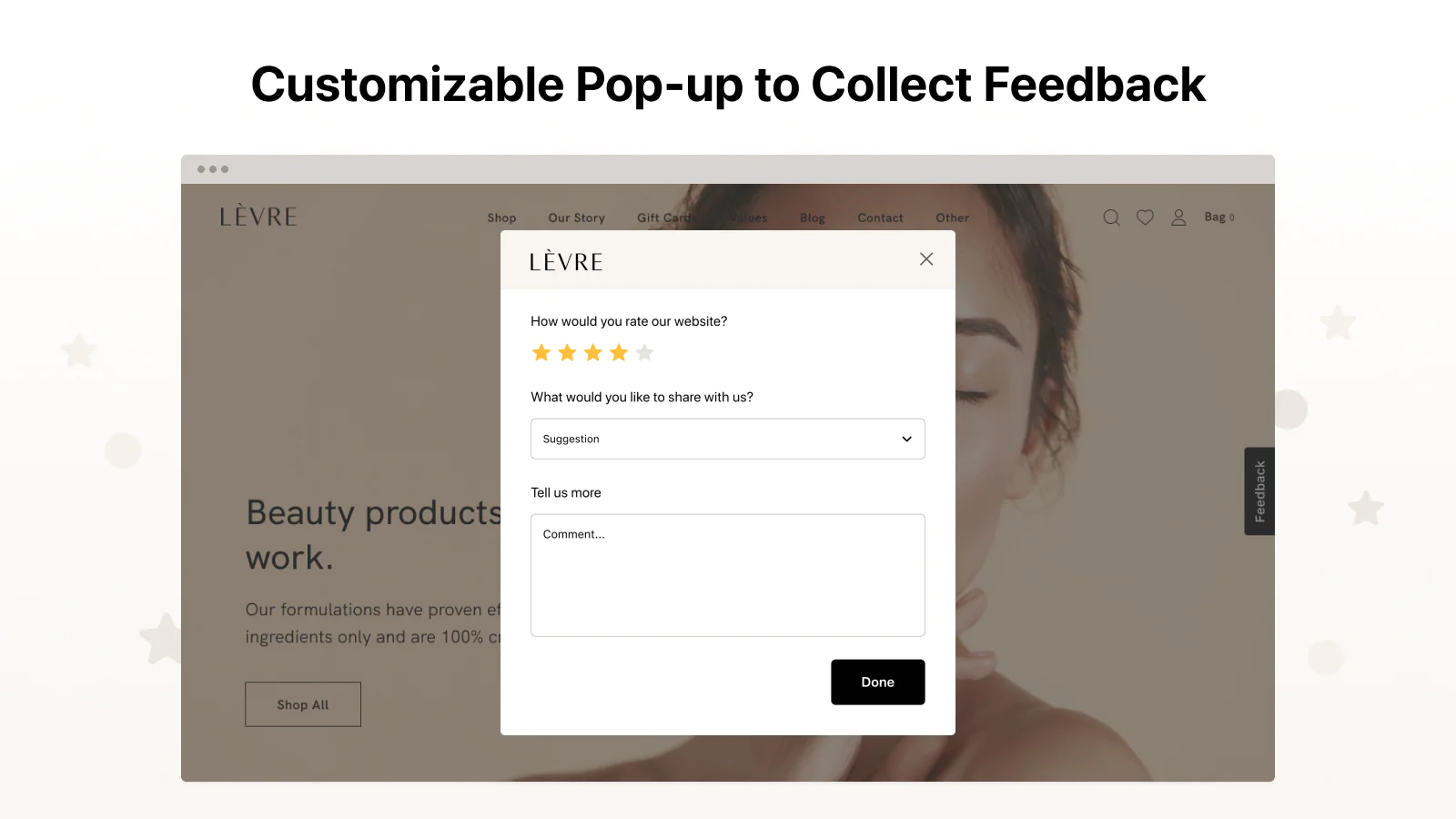 Feedback Button Feedback Button is a button that allows your online store customers to leave a feedback in one click: propose improvement, compliment or report a bug. This information is priceless for merchant. Customer feedback is a key to success and will help you to win competition. How it works The small Feedback button is... The post Best Feedback Button Apps for Shopify in 2022 first appeared on Fab Feedback Button.