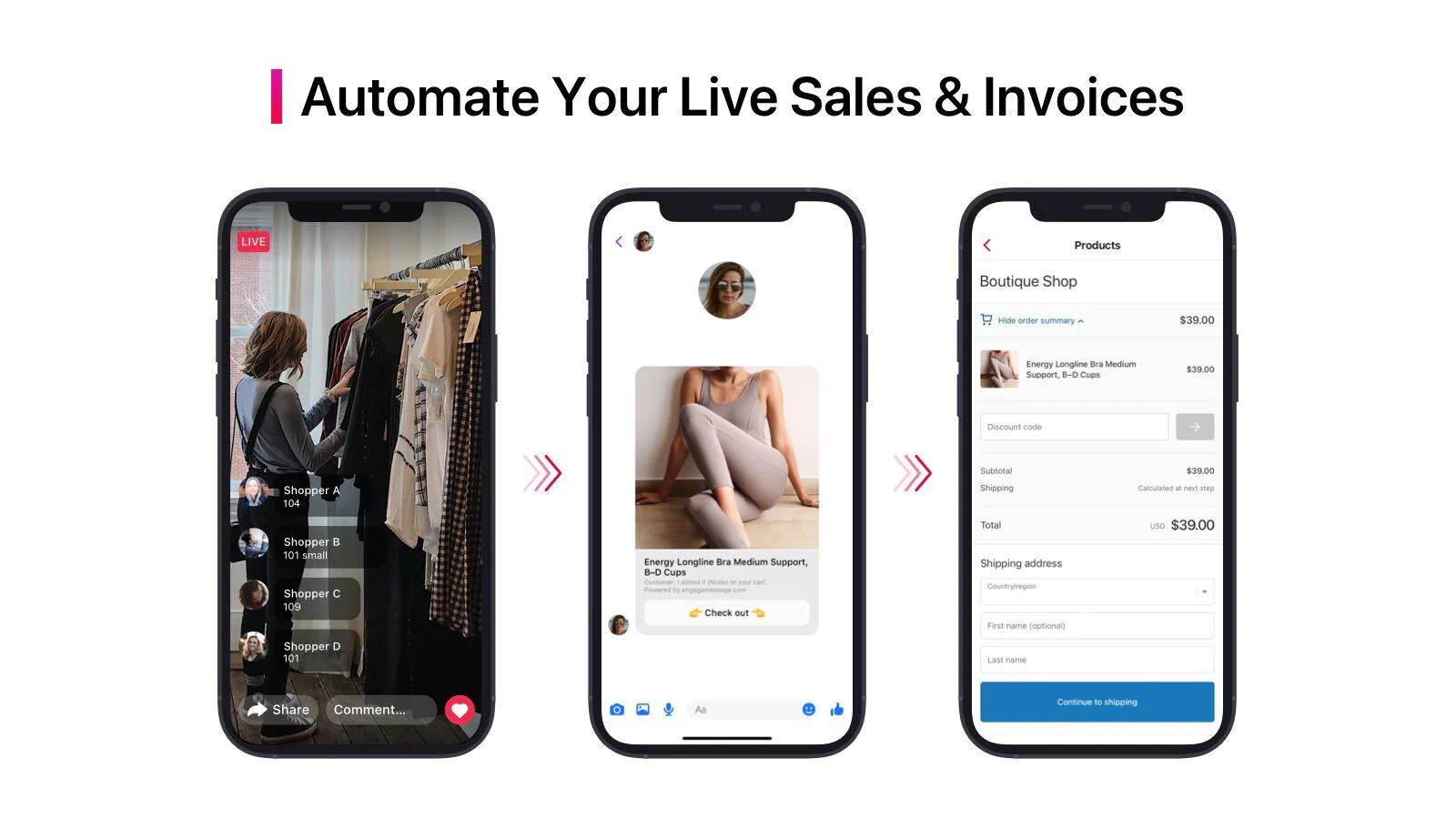 You just need to ask shoppers to comment with the item number during live sales. A direct message will be automatically sent to shoppers who comment. Your shoppers will get a clickable invoice for all the items they comment for and checkout all at once.