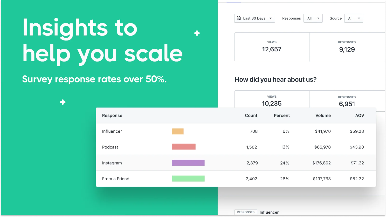 Our post-purchase survey data tells the rest of your marketing stack what it needs to hear. Actionable, easy-to-understand insights from the moment you install. No-code setup in minutes on both Shopify and Shopify Plus.