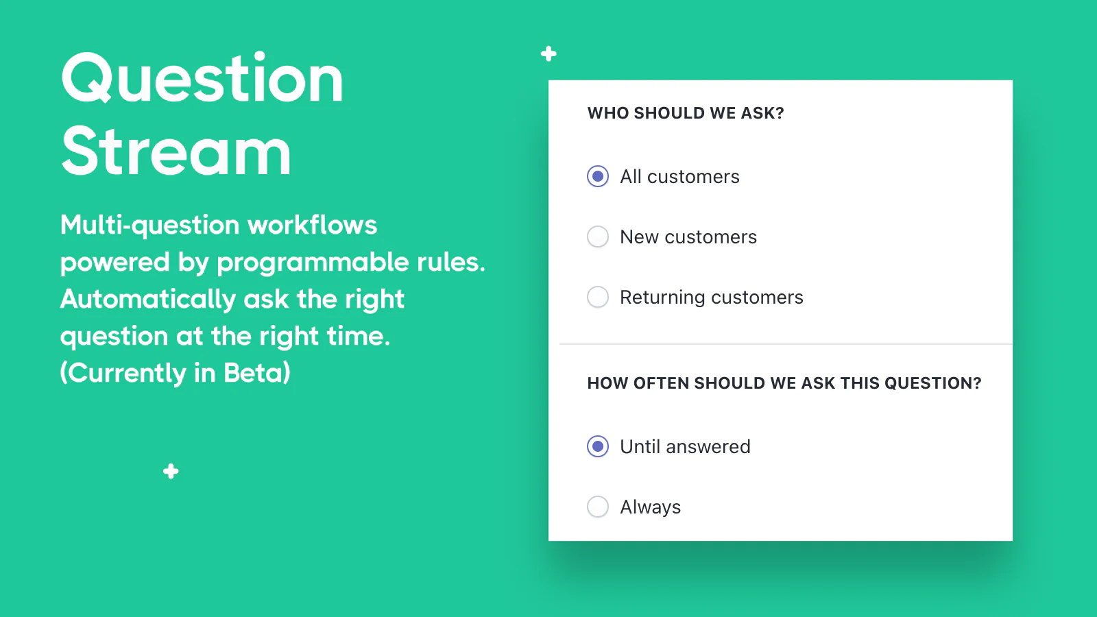 Question Stream Multi-Question : Deliver questions over time with programmable rules, to build stronger customer relationships and increase LTV.