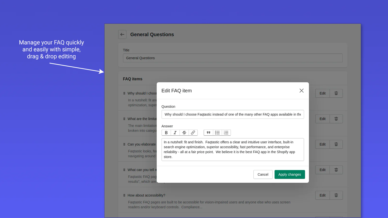 Fast Setup, Simple Management : Simple, intuitive user interface with drag & drop reordering and WYSIWYG text editing allows you to easily set up and manage your FAQs.