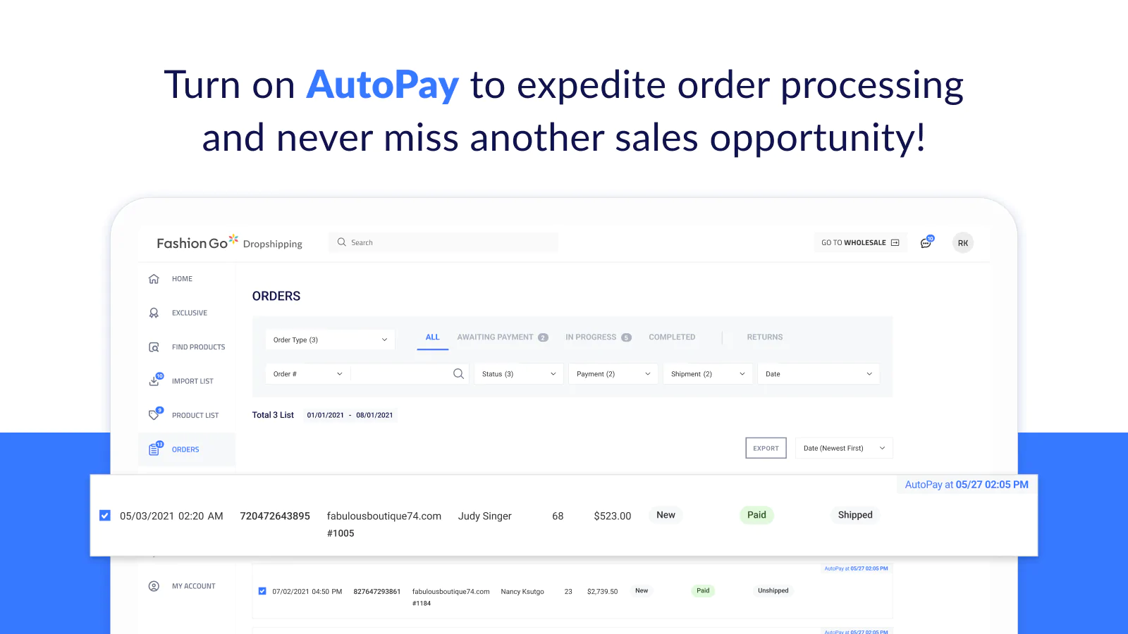 With FashionGo Dropshipping, browse thousands of quality products from curated, US-based vendors. Automatically sync your customers’ details to ensure hassle-free order fulfillment. Setup auto-pay to make sure your orders are processed right away. All completely free.