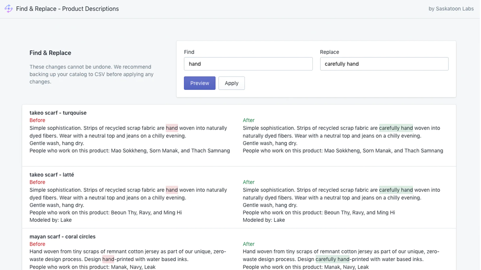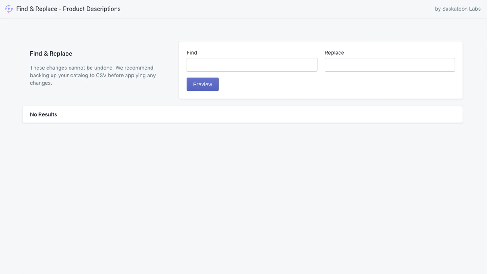 Before making changes to your product descriptions using this app, we recommend that you back up your catalog using the export to CSV feature Shopify provides.