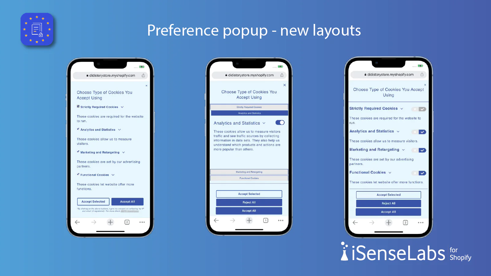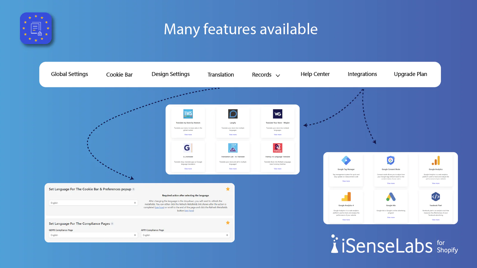Multilingual Cookie Bar : Multiple options for translation of the cookie bar - automatic, manual and with 3rd party translation apps. Available for all plans.
