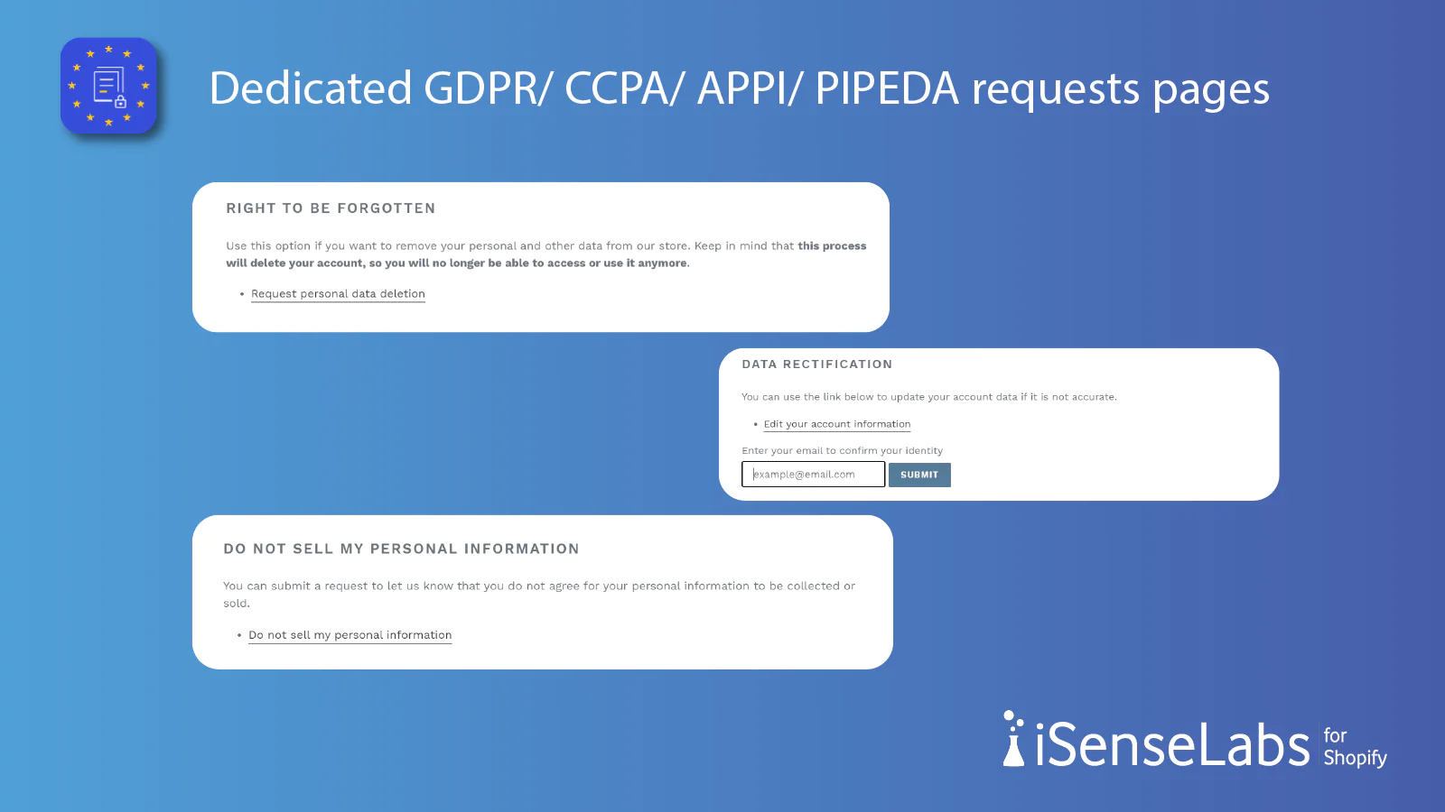 Compliance Pages : Pre-generated pages for GDPR/CCPA/APPI with the app install. Your customers can make all kinds of requests: account edit, data erasure etc.