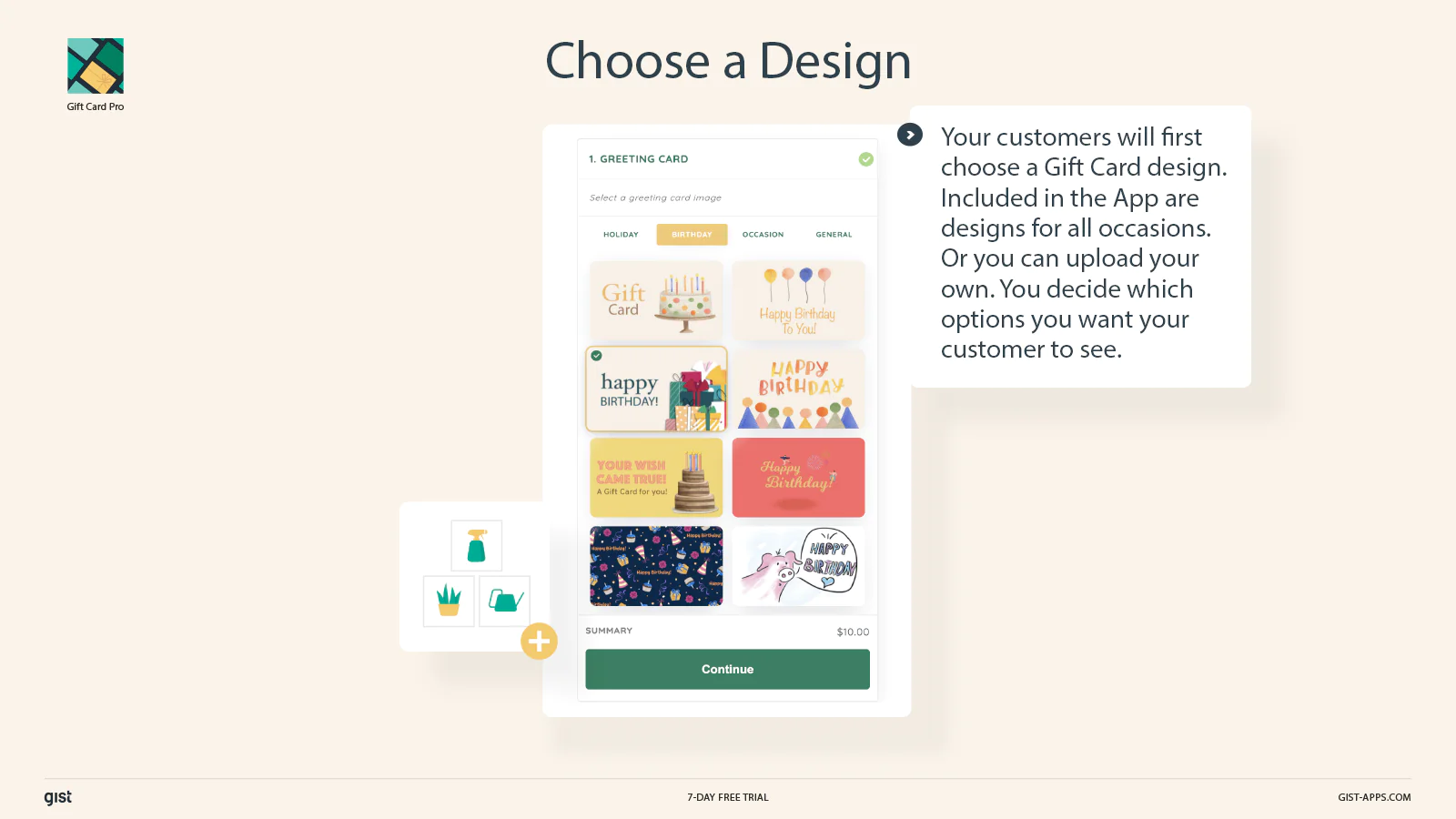 Gift Card Pro comes with a pre-made set of Gift Card designs, which you can choose to show to your customers or not. You can also upload as many of your own designs as you wish. If you only want to offer your customer one design, no problem! One hundred? Great! They can also be neatly organized during the purchasing process under individual categories, such as Holidays, or Birthdays!