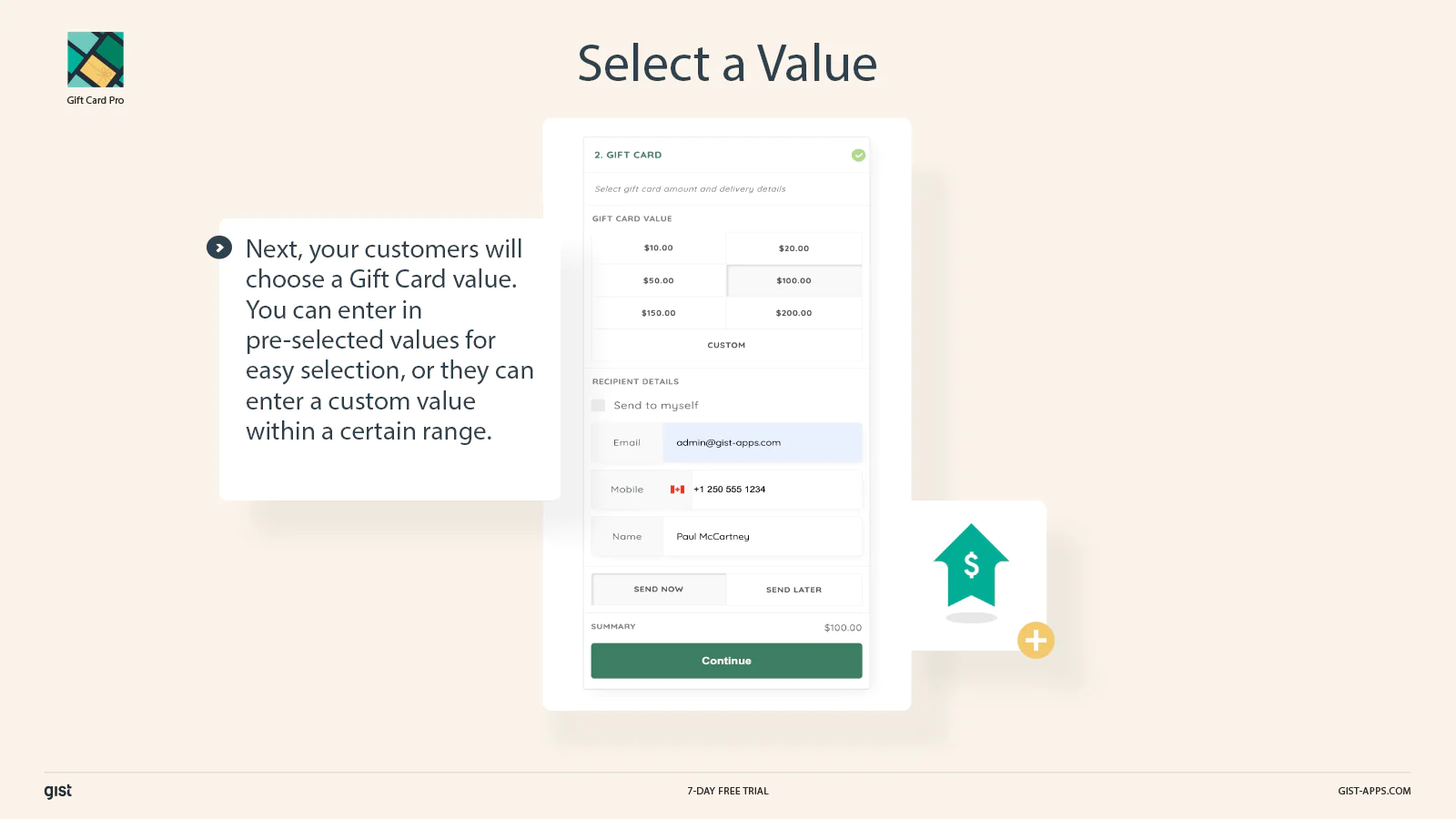 Pre-set certain Gift Card values that your customers can choose from to make the purchasing process easy, such as $25, $50, $100. You can also add in a custom value box with a specified range. For instance, let your customer enter in any value between $1 - $2,000. They want to send their granddaughter a Gift Card for $750? Done!