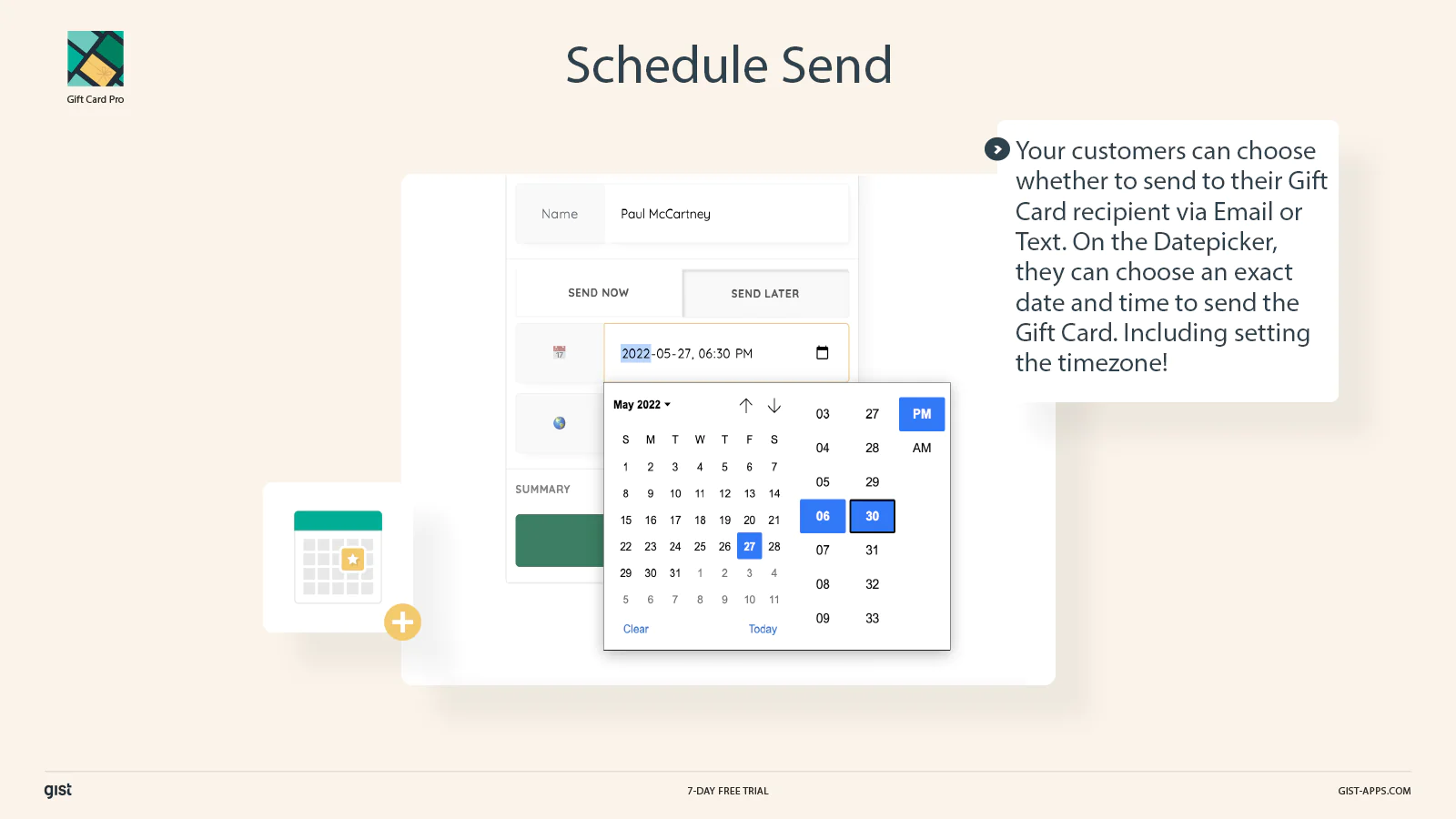 Your customer can choose a specific date or time to send the Gift Card to the recipient, or they can send it instantly. Is their client's birthday on May 7th? Perfect, I'll send it to them at 3PM on the exact day! In the PST timezone!
