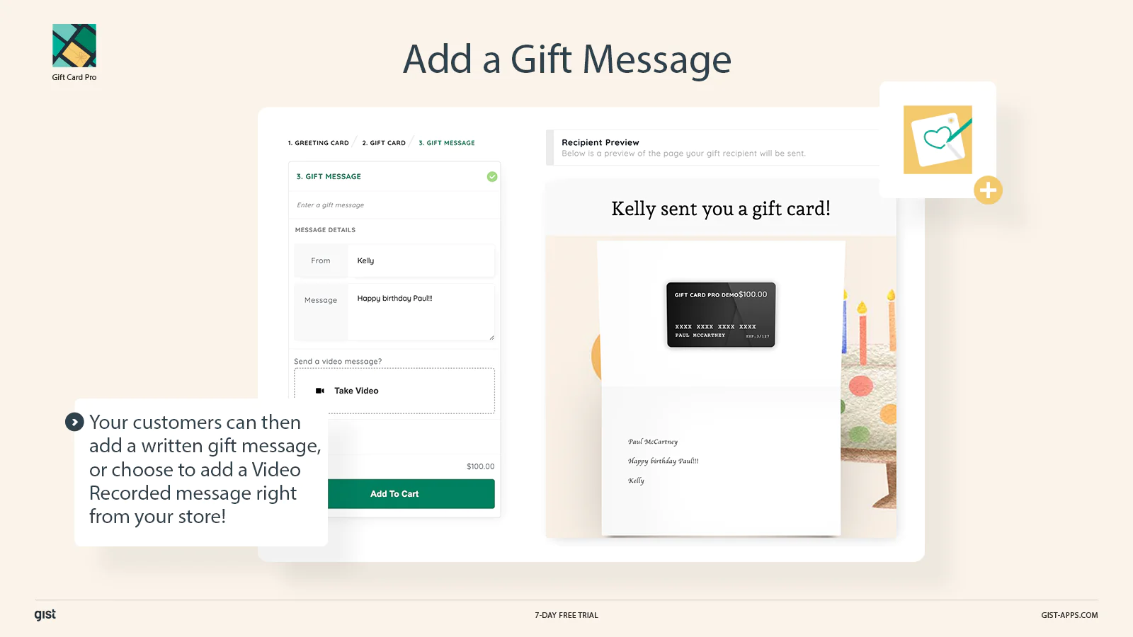 What's a gift without a heartfelt message? With Gift Card Pro, not only can your customer add in a personalized gift message, but they can record a video message right from your store!