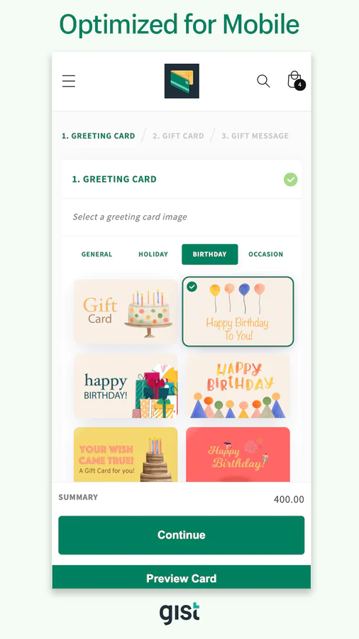 A Complete Gift Card Program : Comes with 50+ Gift Card designs (or upload your own), Multi-currency / languages, Pre-set or custom values, compatible with any screen size