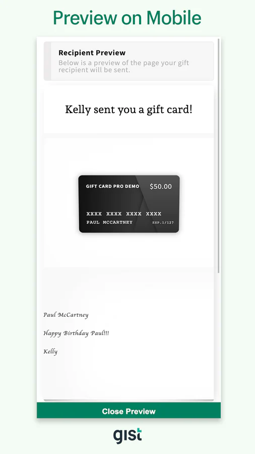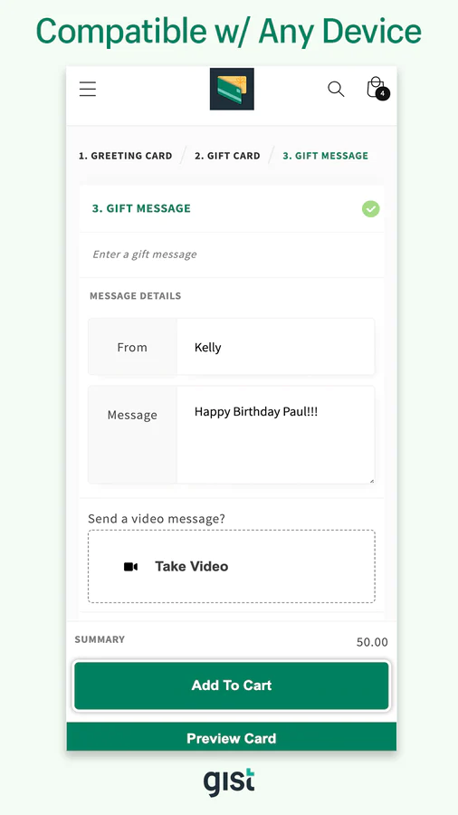 Make Gift Cards Easy To Gift : Your customers will have the option to include a written gift message and record a video greeting to send to their Gift Card recipient!