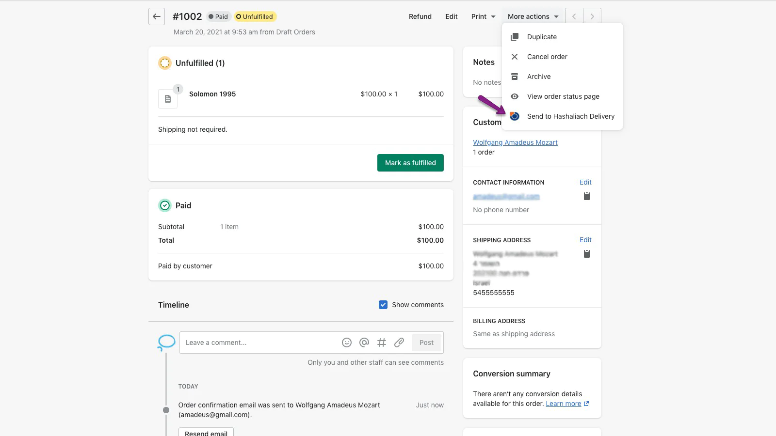 Save Time : Easily generate your Hashaliach shipments directly from the order view