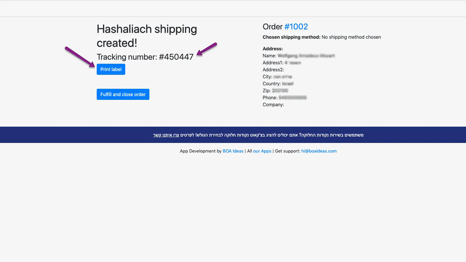 Link to Hashaliach Delivery : Tracking number received via the order screen and linked to Hashaliach shipments system