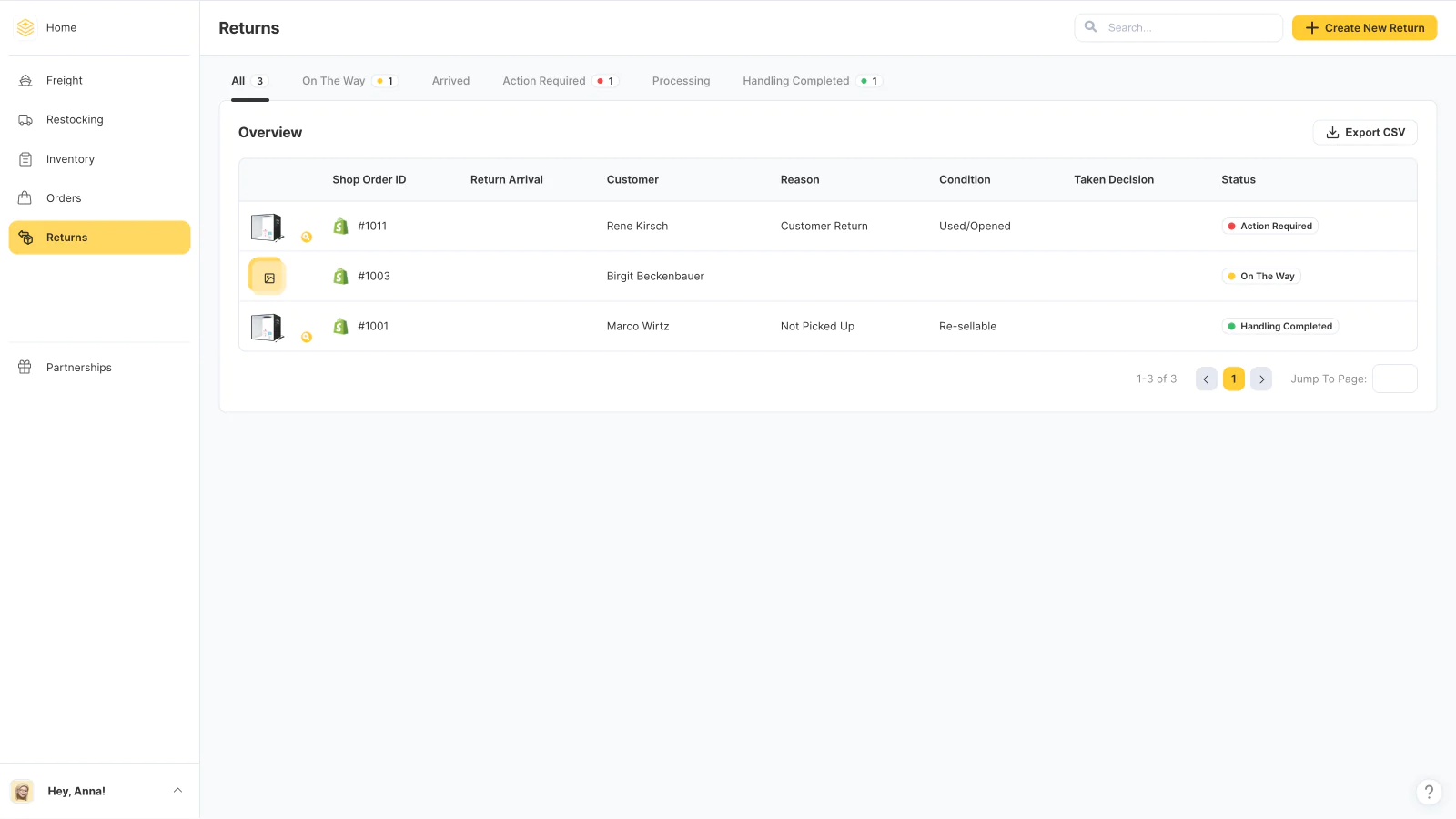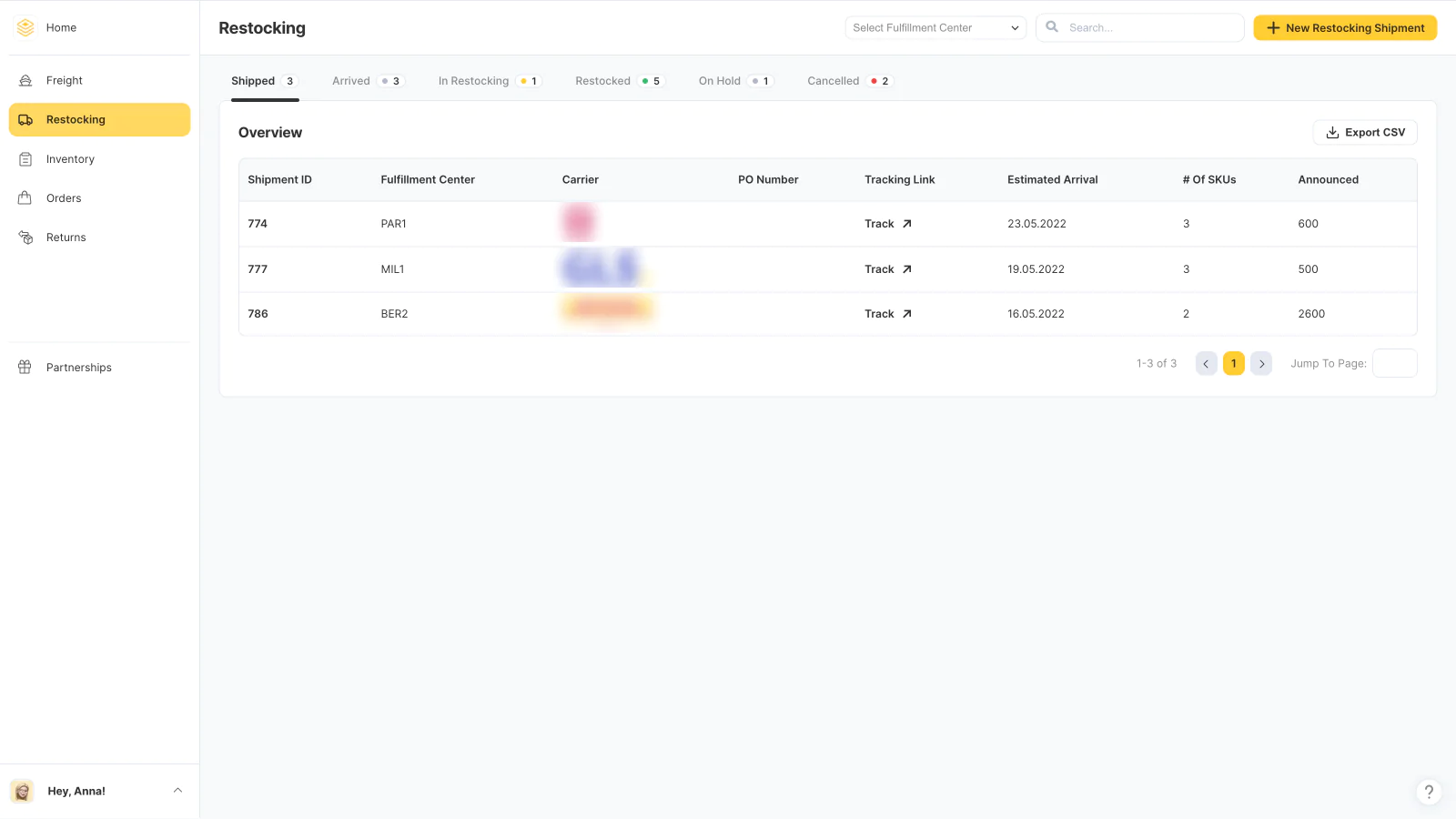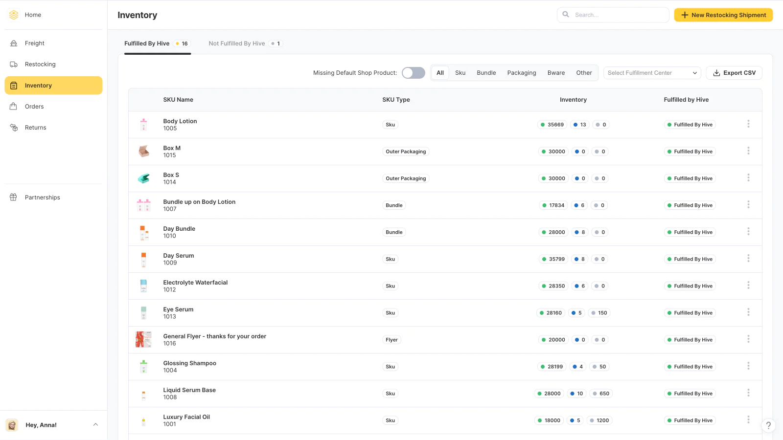 Hive app enables you to manage product inventory, restocking shipments, orders, and returns. Your Shopify orders are directly transferred to our system, which allows us to pick, pack and ship your orders fast and seamlessly. Additionally, you are able to check your inventory at any time through our app and send us restocking shipments whenever stock is running low.