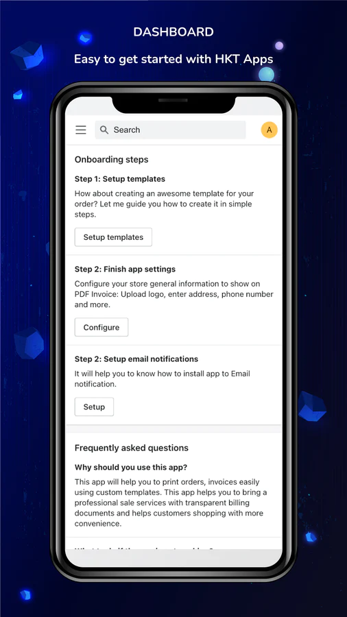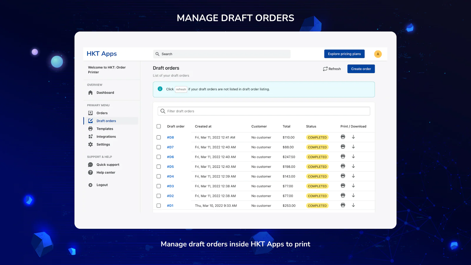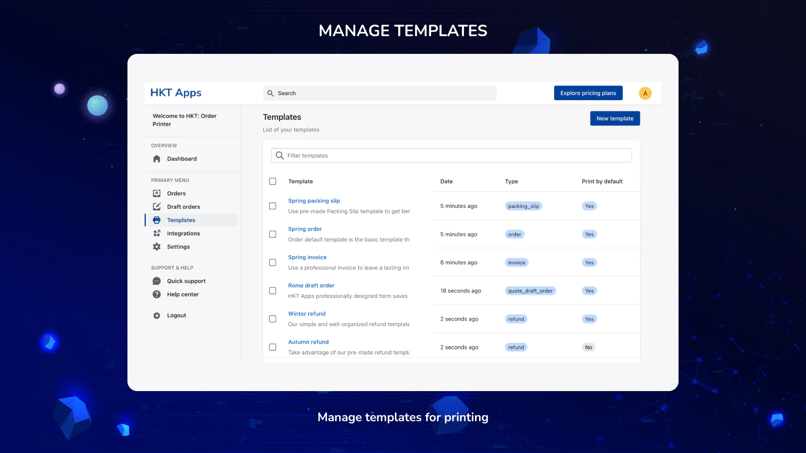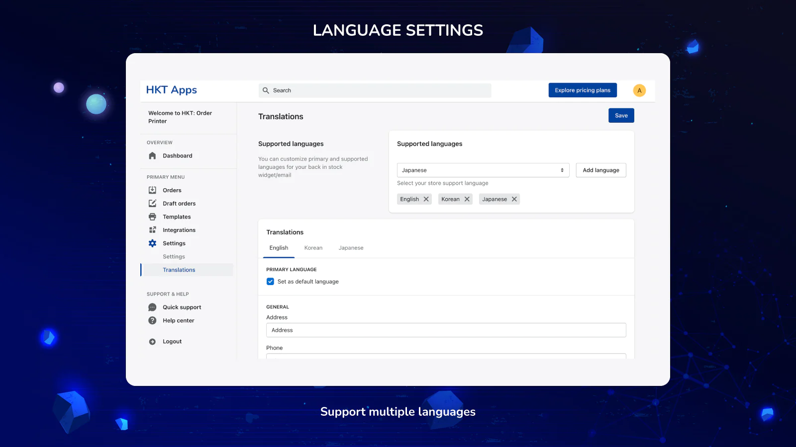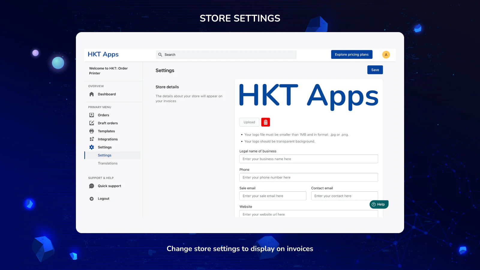 You can build professional templates for your orders, draft orders by updating the store information, date-time, currency standard from the setting page, also configuring the template options.