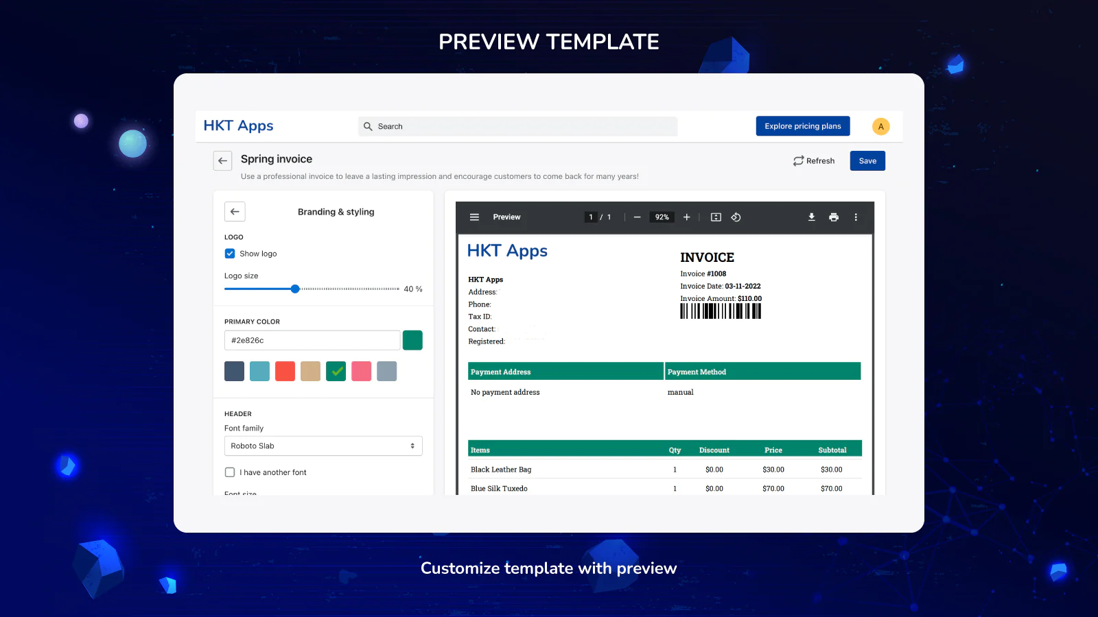 With HKT Apps, our goal is to help you create PDF invoices easily without coding. Our app supports 5 ready-to-use templates for: