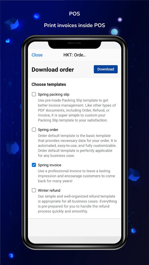 The app was built to optimize for POS devices and mobile, so you can create your documents for orders from anywhere.