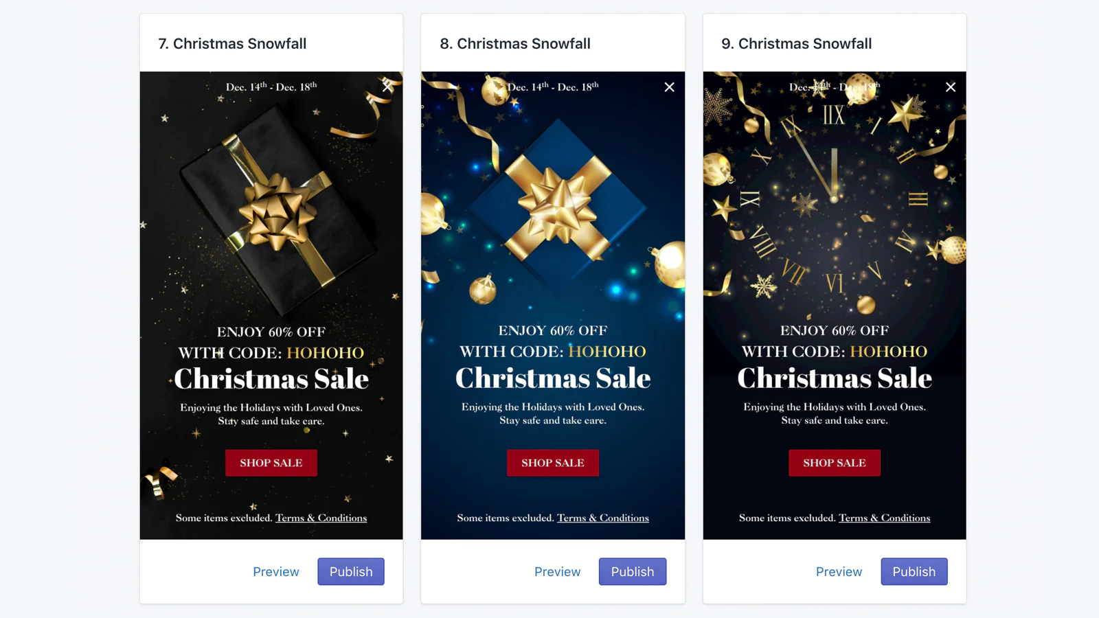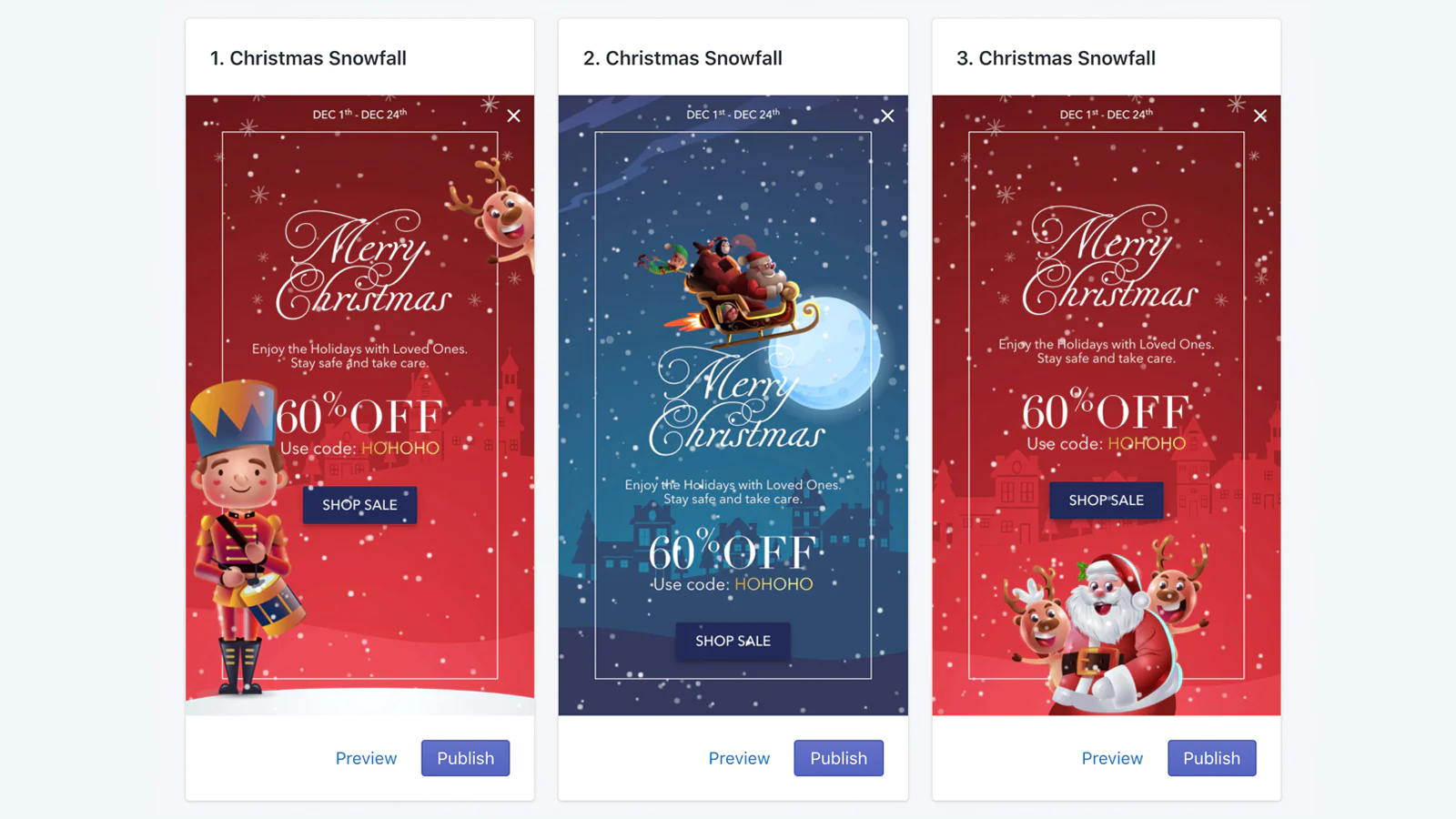 30 sale pop ups for Holidays : Promote sales and discount coupons with 30 customizable Christmas, Boxing Day, and Black Friday pop up banners. We have snow also!