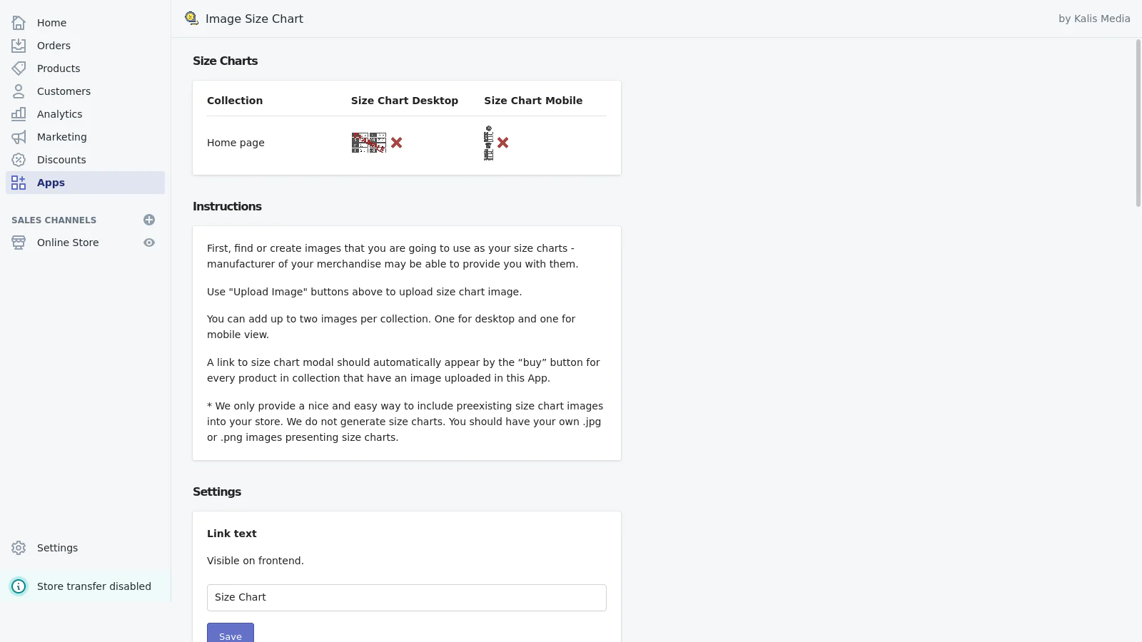 To get started, simply install our app. Then upload your size chart images for different collections. A "Size Chart" link will be automatically added to all products in that collection.