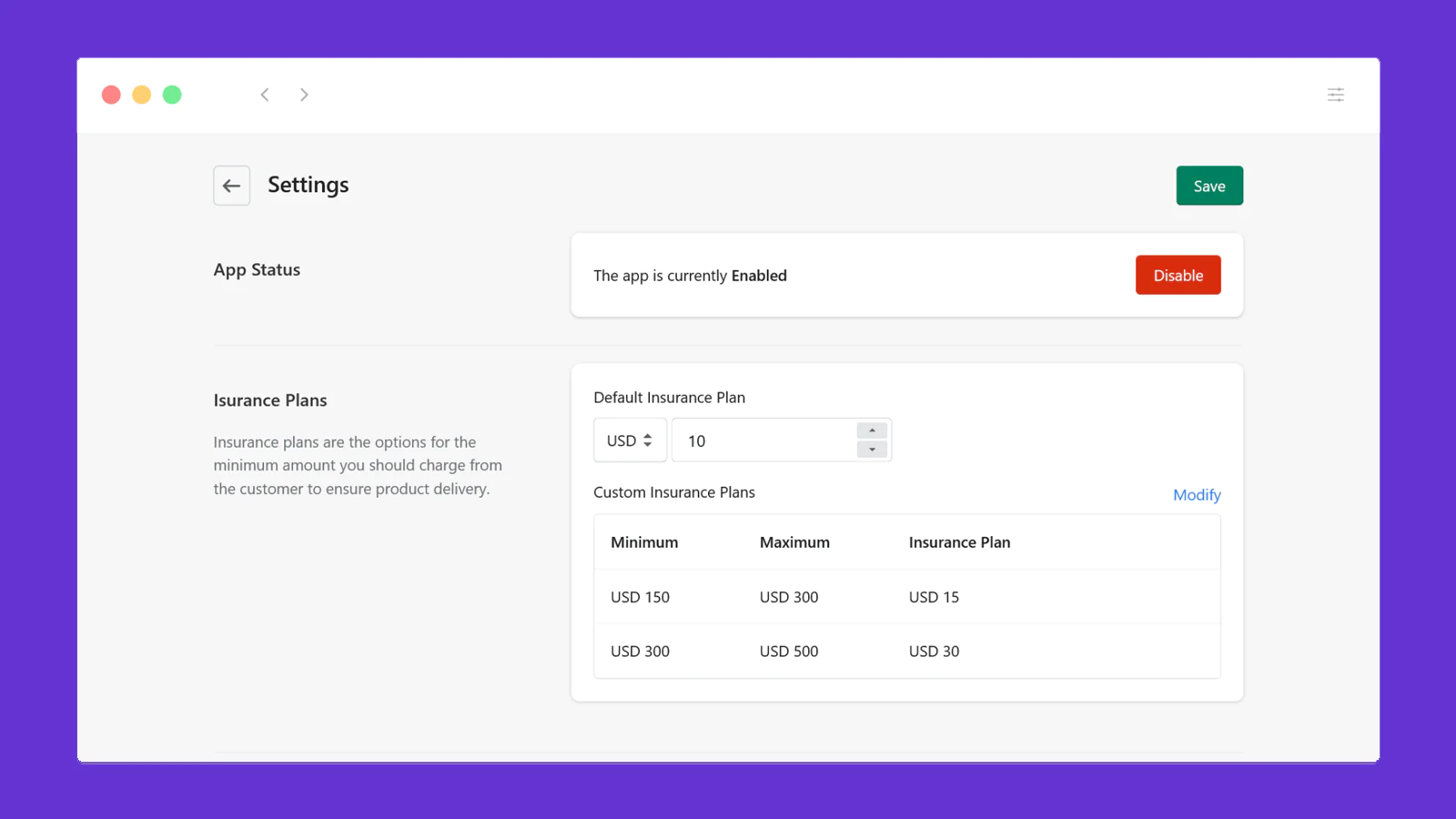 Set a custom insurance plans that depends on the cart subtotal, You can set a fixed minimum value and a maximum value for the cart.