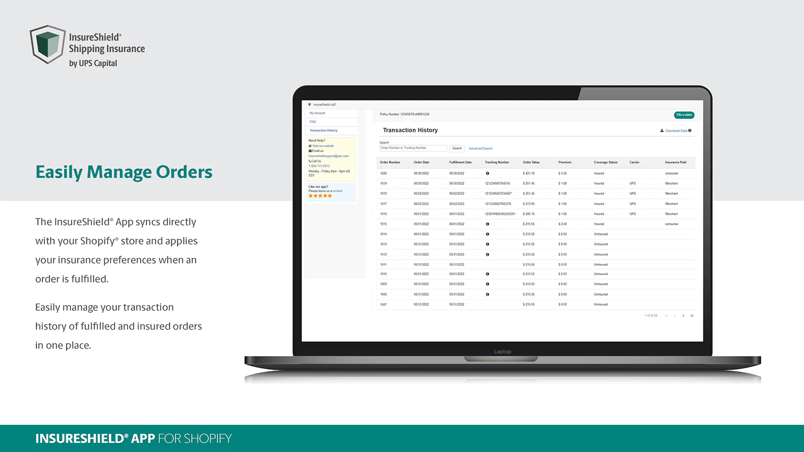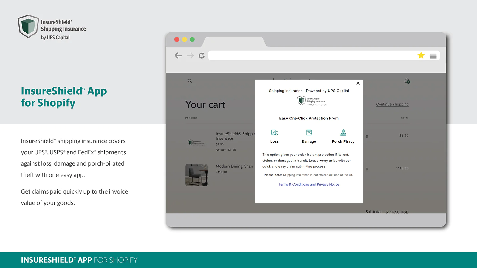 A bad shipping experience can have repercussions. When a shipment is lost or damaged in transit or stolen by porch pirates, your reputation can hang in the balance. With InsureShield shipping insurance now available to Shopify® merchants through an easy-to-use app, you have the power to create loyalty and repeat purchases by taking care of your customers when there is a shipping mishap.