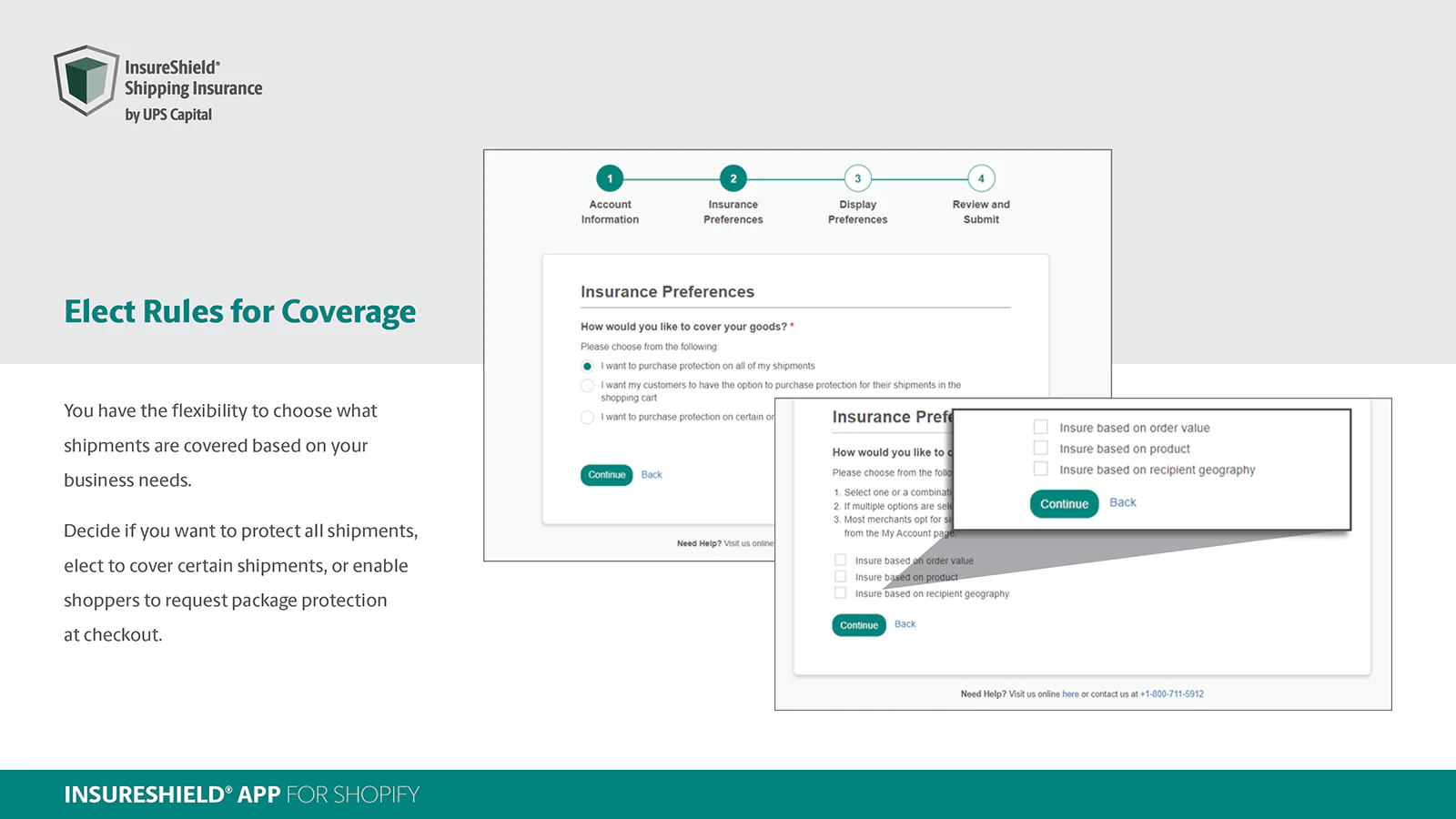 Flexible Package Protection : Choose flexible insurance coverage for orders, with options to cover some or all orders, or enable shoppers to elect protection at checkout.