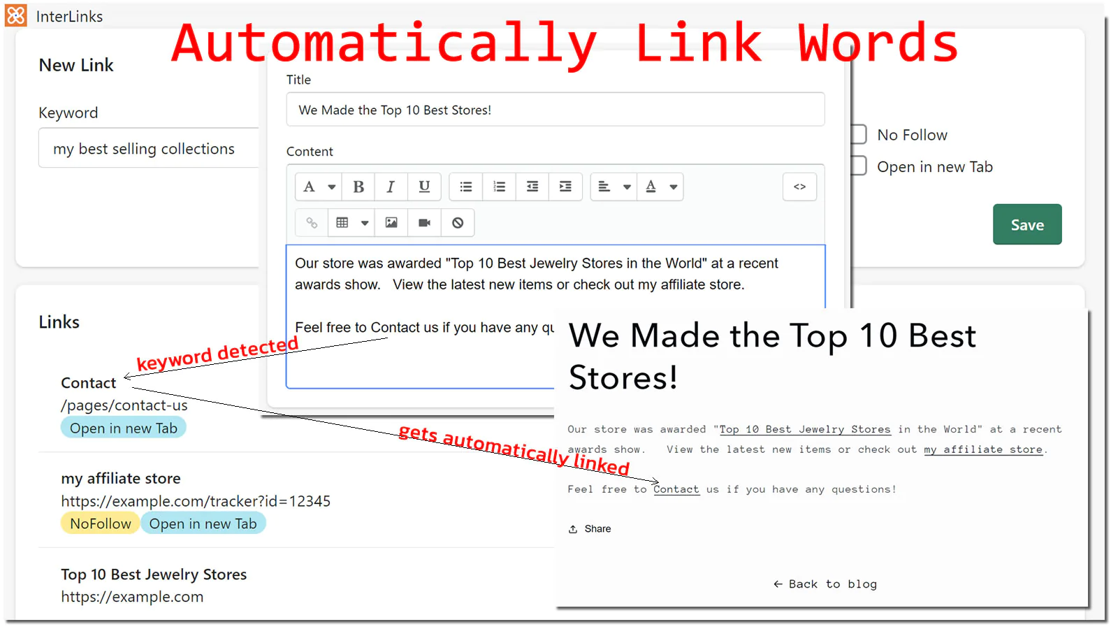 Here's your situation: You've crafted a blog post and now it's time to link references to your Collections and Products so you scan your post and start the process of "interlinking" your post's text to relevant parts of your store. InterLinks automates this task for you. Once you've entered in your keywords, InterLinks will link the word to the Target URL that you've specified.