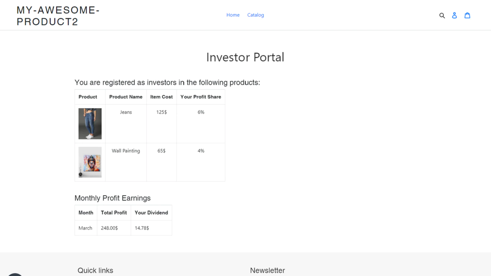 With the investor portal app you can show your investors accurate sales data for the products they have invested in, on the frontend of your store. The app also calculates their dividends based on the profit margin and show this data on the frontend of your store. Only a user tagged as investor, will see this data on the frontend of your store.