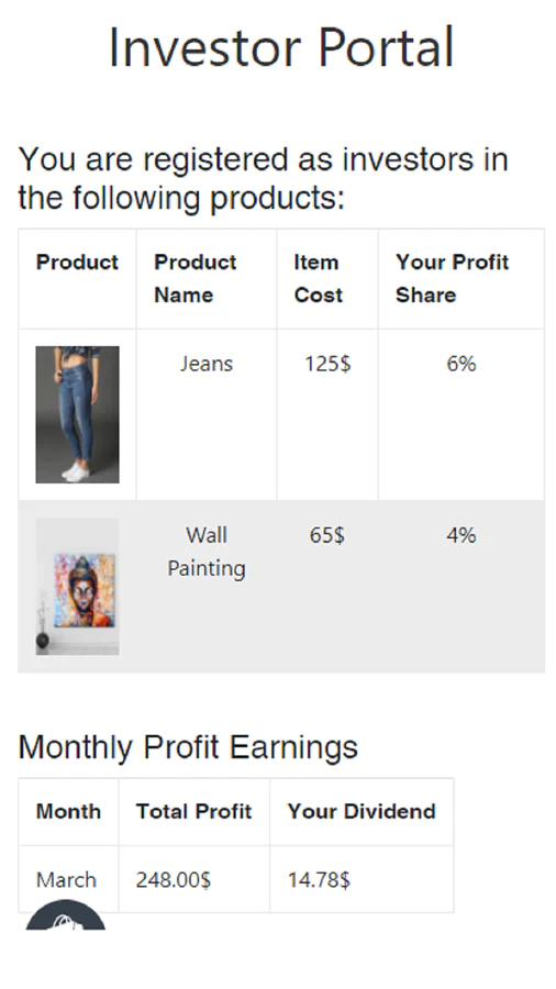 Full Transparency for Investor : Show the logged in investors, accurate stats for the products they have invested in and their dividends based on profits