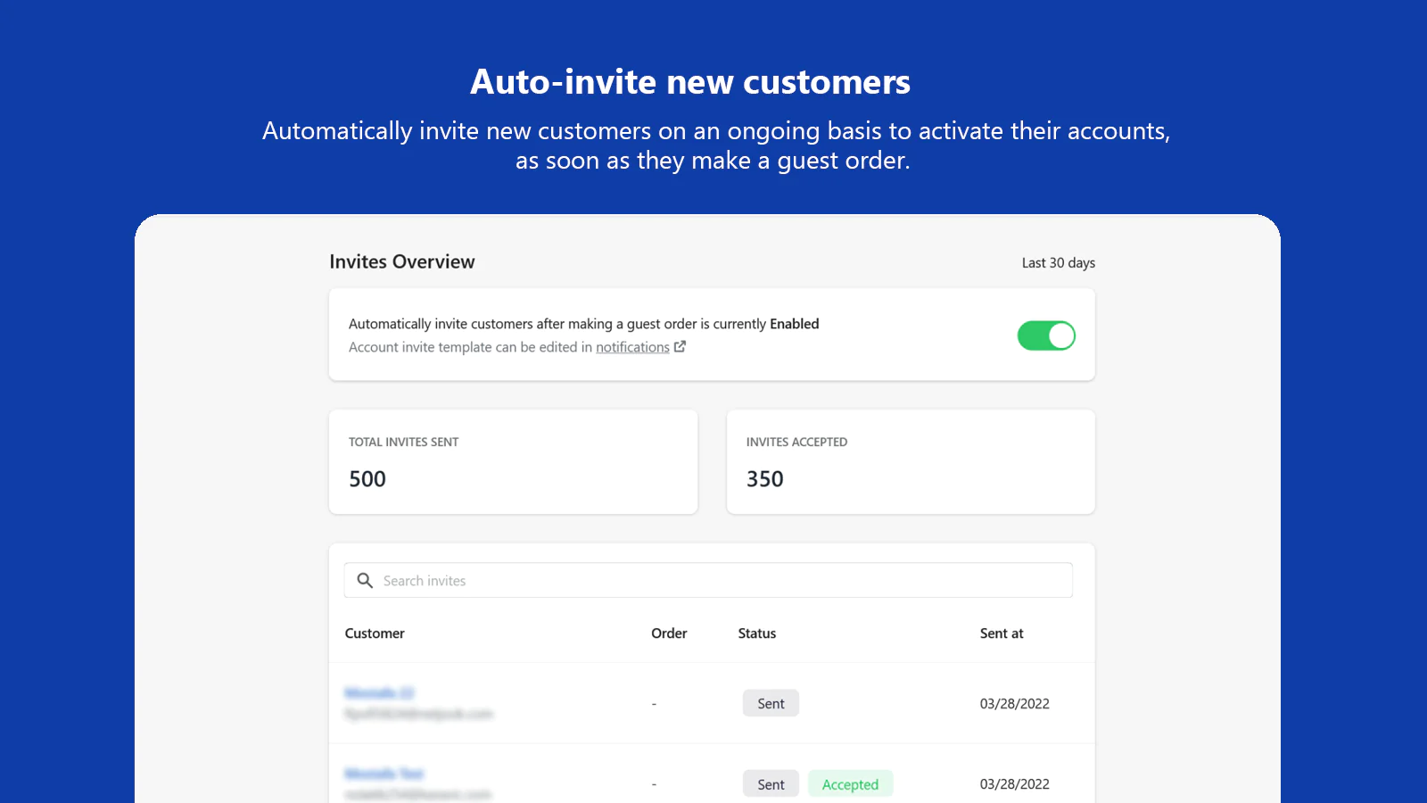 Auto-invite new customers : Automatically invite new customers on an ongoing basis to activate their accounts, as soon as they make a guest order.