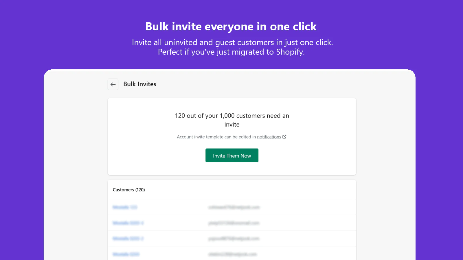 Invite everyone in one click : Invite all uninvited and guest customers in just one click. Perfect if you've just migrated to Shopify.