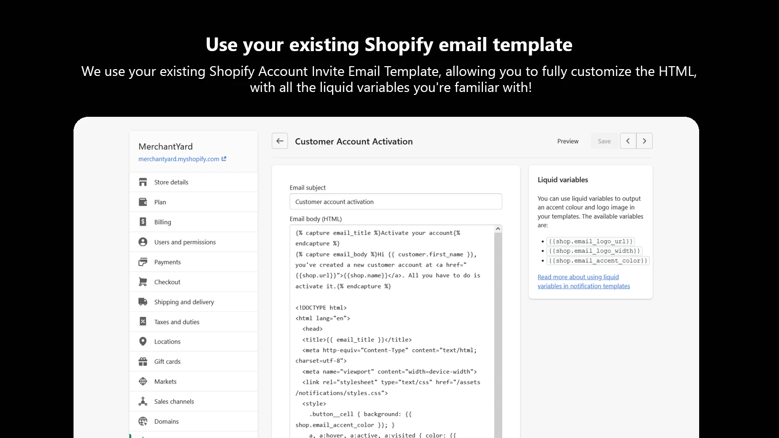 We use your existing Shopify Account Invite Email Template, allowing you to fully customize the HTML, with all the liquid variables you're familiar with!