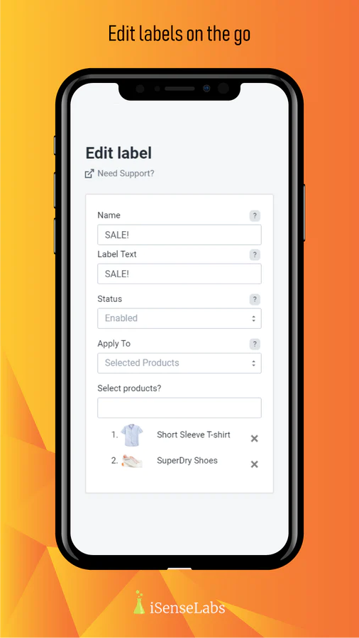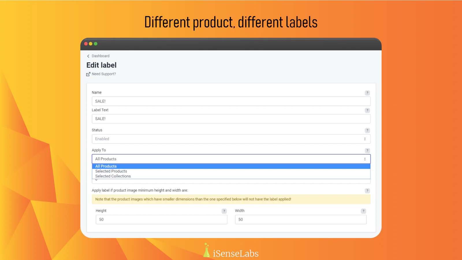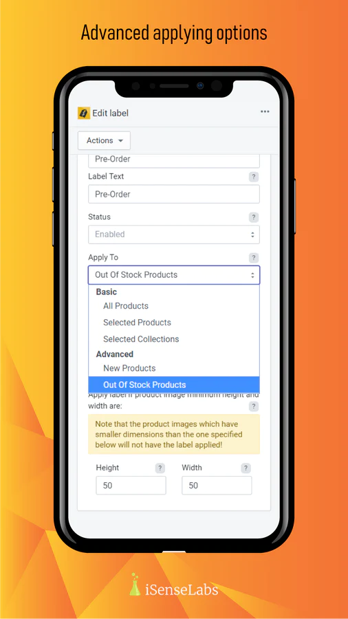 You will be able to apply labels to All Products, Selected Products, Selected Collections, New Products or Out of Stock Products.