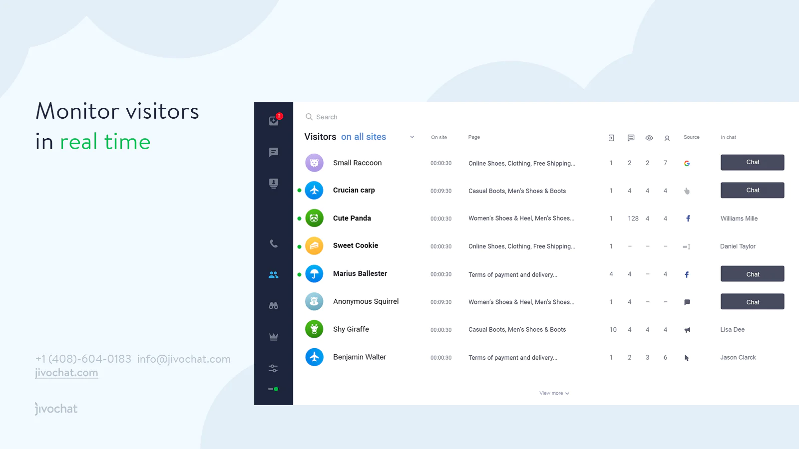 Visitor Monitoring & Smart Triggers: Track your visitors in real time and proactively initiate live chats with them